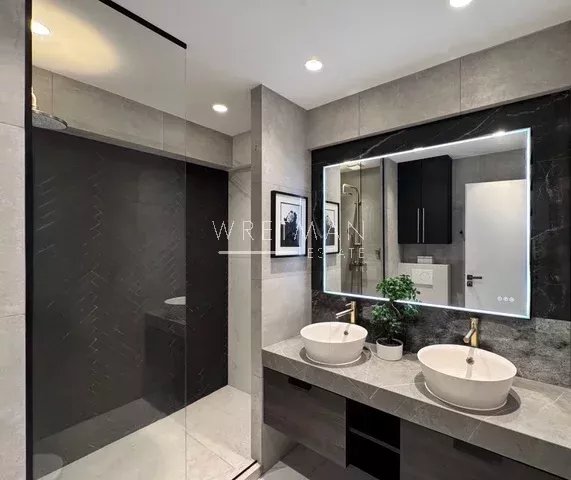 La partie nuit se compose de deux chambres avec de nombreux rangements : la première bénéficie d’un accès direct à la terrasse, tandis que la seconde dispose de son propre balcon privatif. Une élégante salle d’eau contemporaine, dotée d’une double vasque, d’une douche à l’italienne et d’un WC, complète l’ensemble.