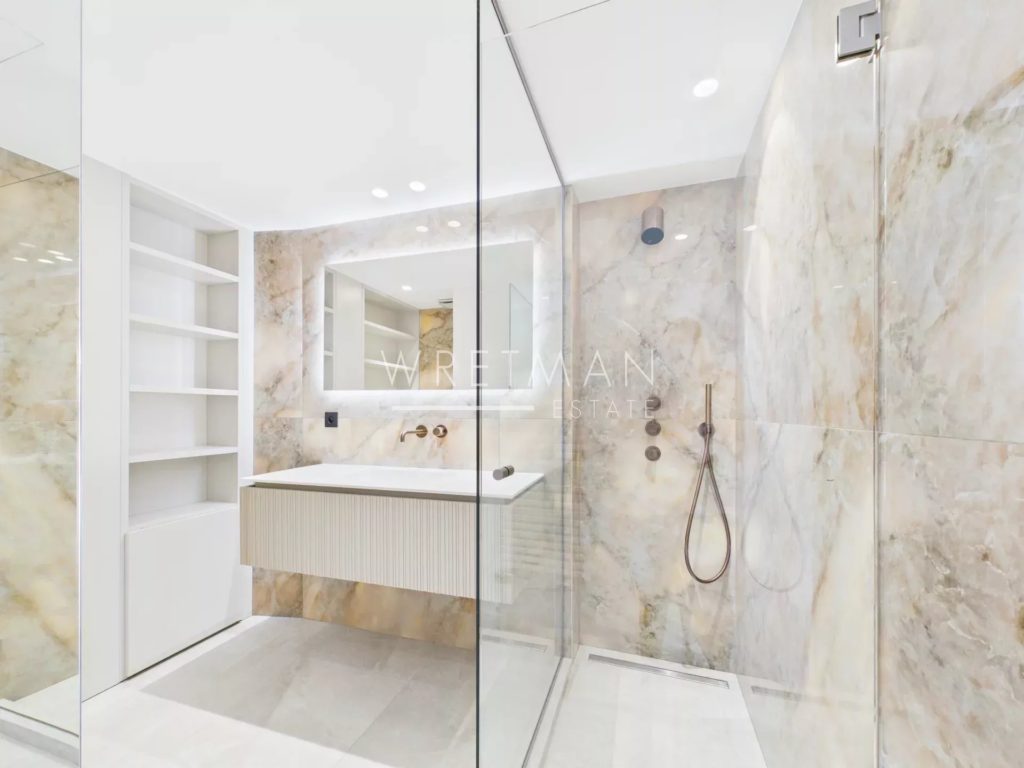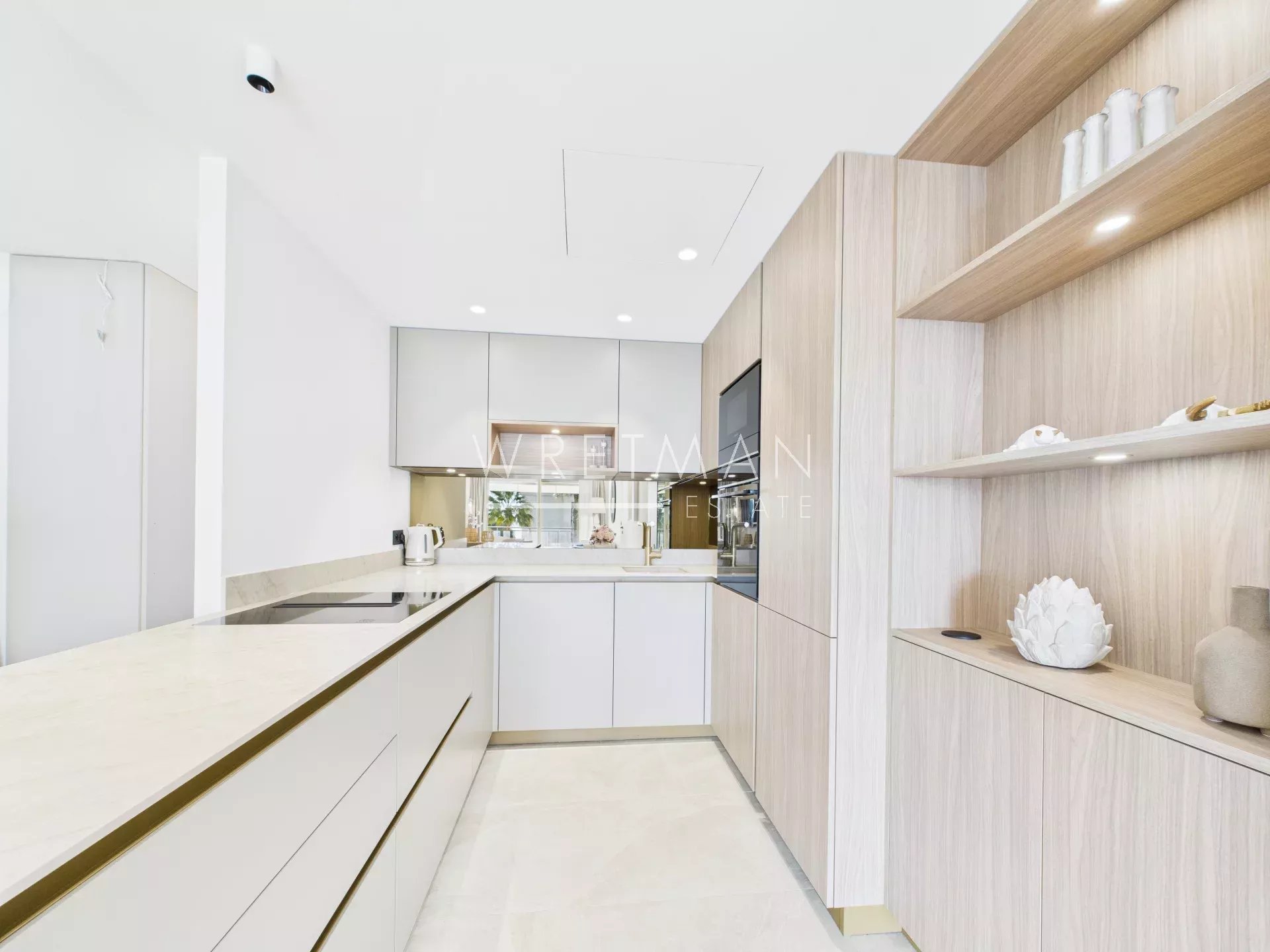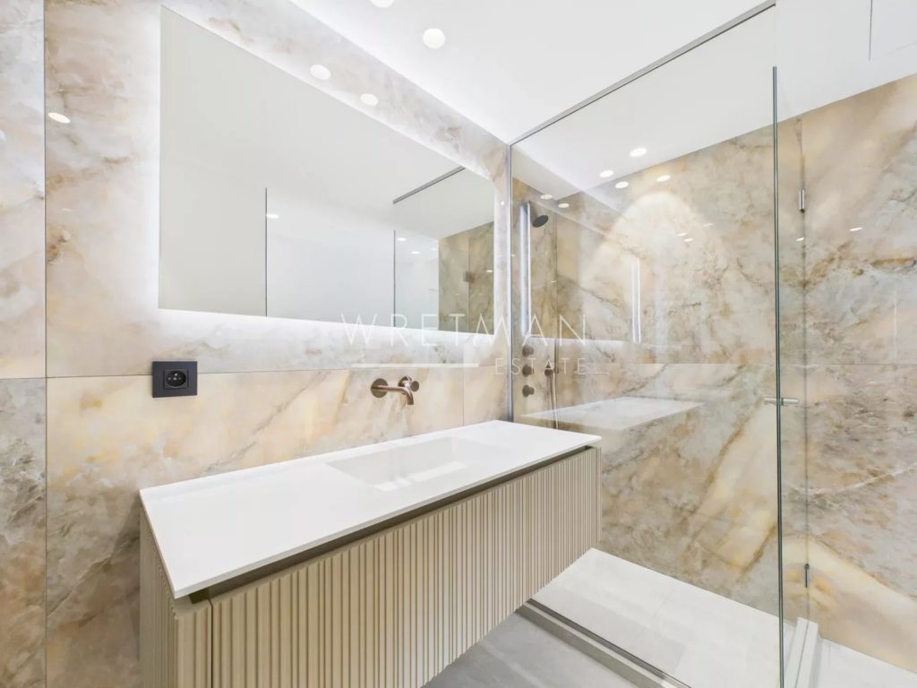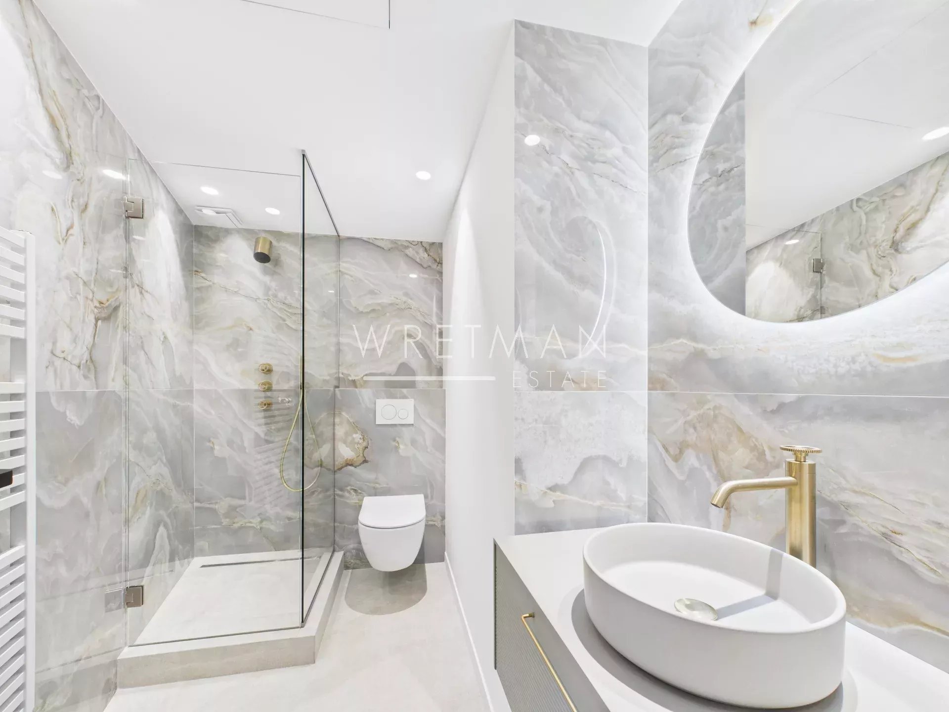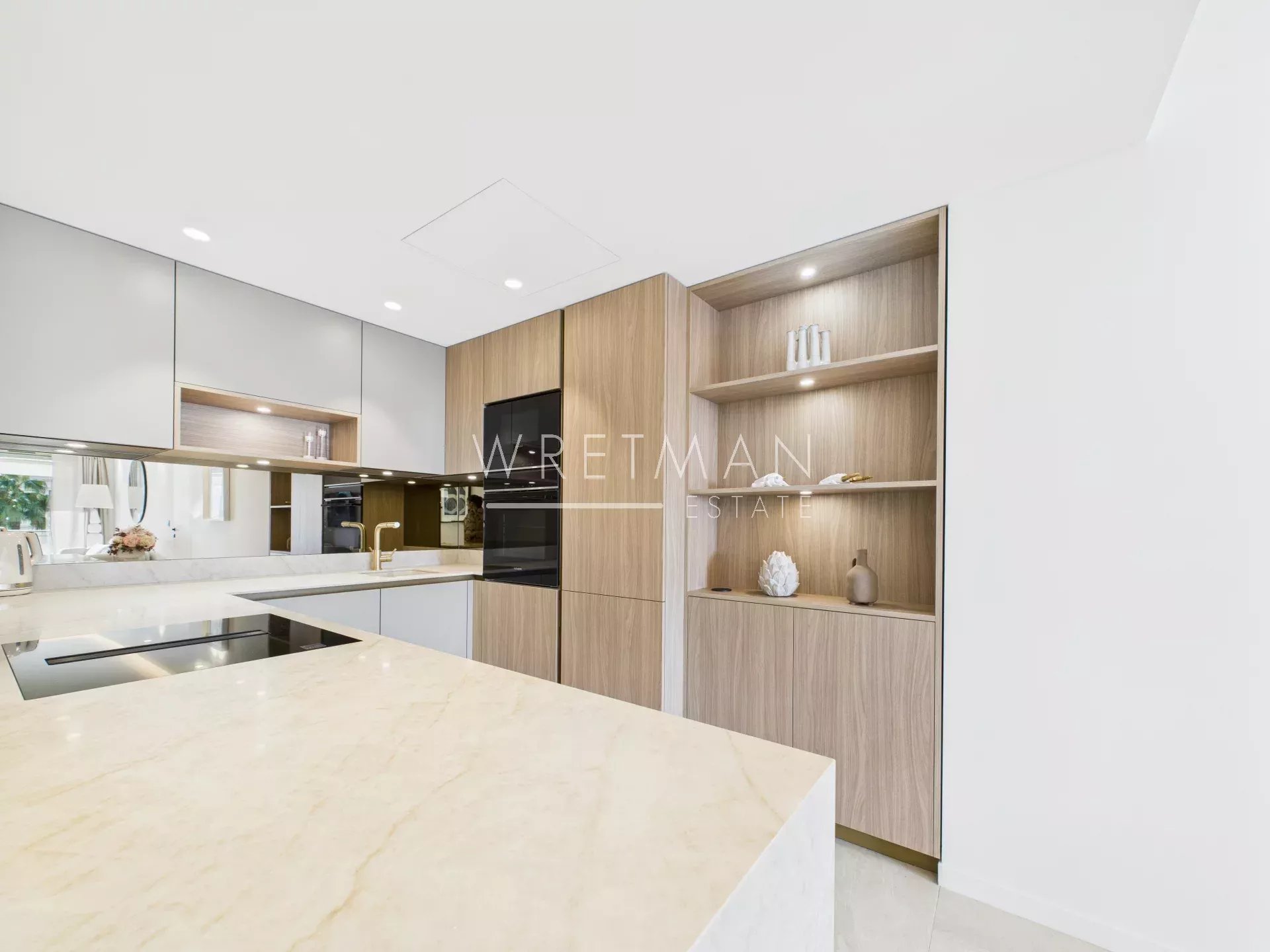 Ce magnifique appartement au deuxième étage a été entièrement rénové avec des matériaux haut de gamme et se compose d’une entrée, d’un séjour lumineux avec espace salle à manger et cuisine aménagée et équipée. Le séjour s’ouvre sur une terrasse de 12,35 m² offrant une vue dégagée sur la mer et le parc.