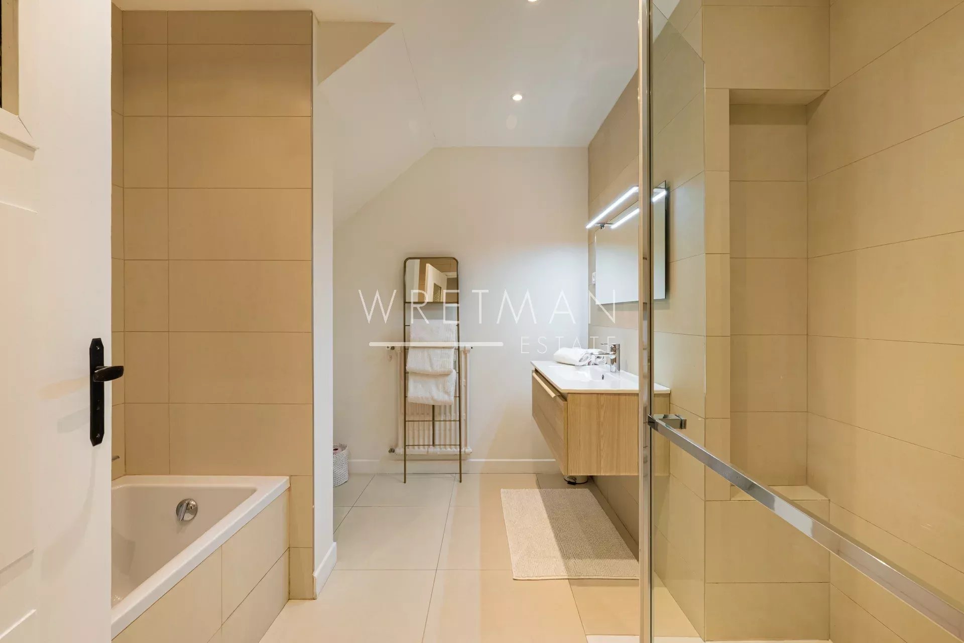 Depuis le hall d’entrée élégant, un escalier remarquable mène à l’étage supérieur dédié à l’espace nuit. Celui-ci se compose de quatre chambres, dont une superbe suite parentale avec dressing et salle de bains attenante, ainsi que deux salles d’eau supplémentaires et des toilettes invités. Une terrasse baignée de lumière vient parfaire ce niveau, créant une continuité naturelle avec l’extérieur.