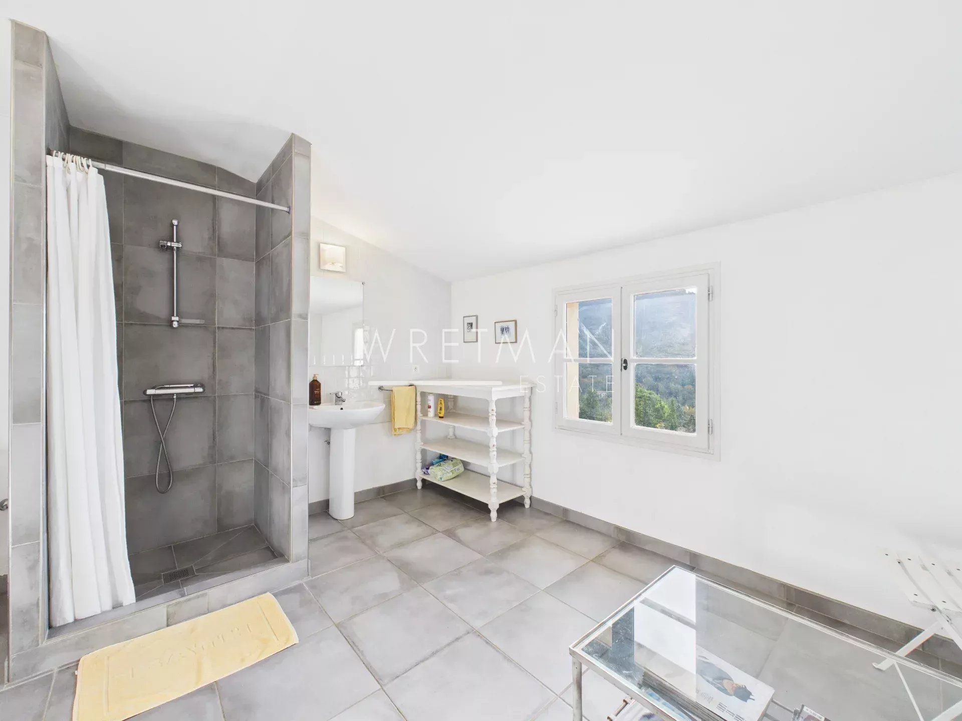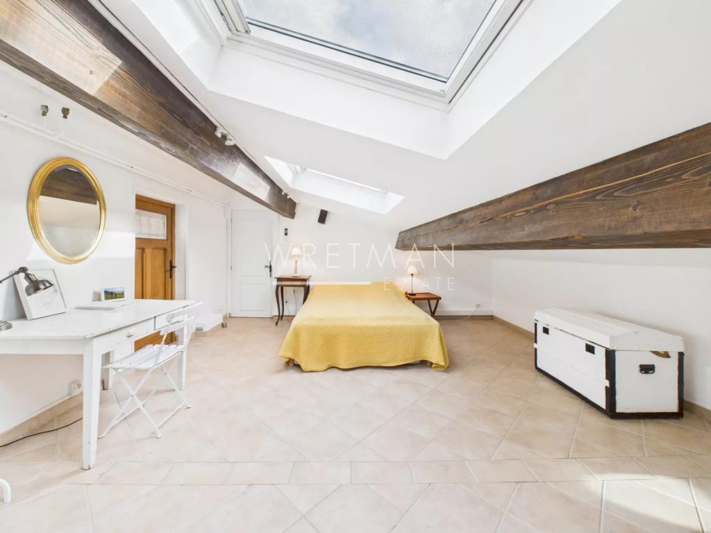 À l’étage, deux chambres mansardées, dont l’une particulièrement spacieuse, se partagent une vaste salle de douche avec wc.