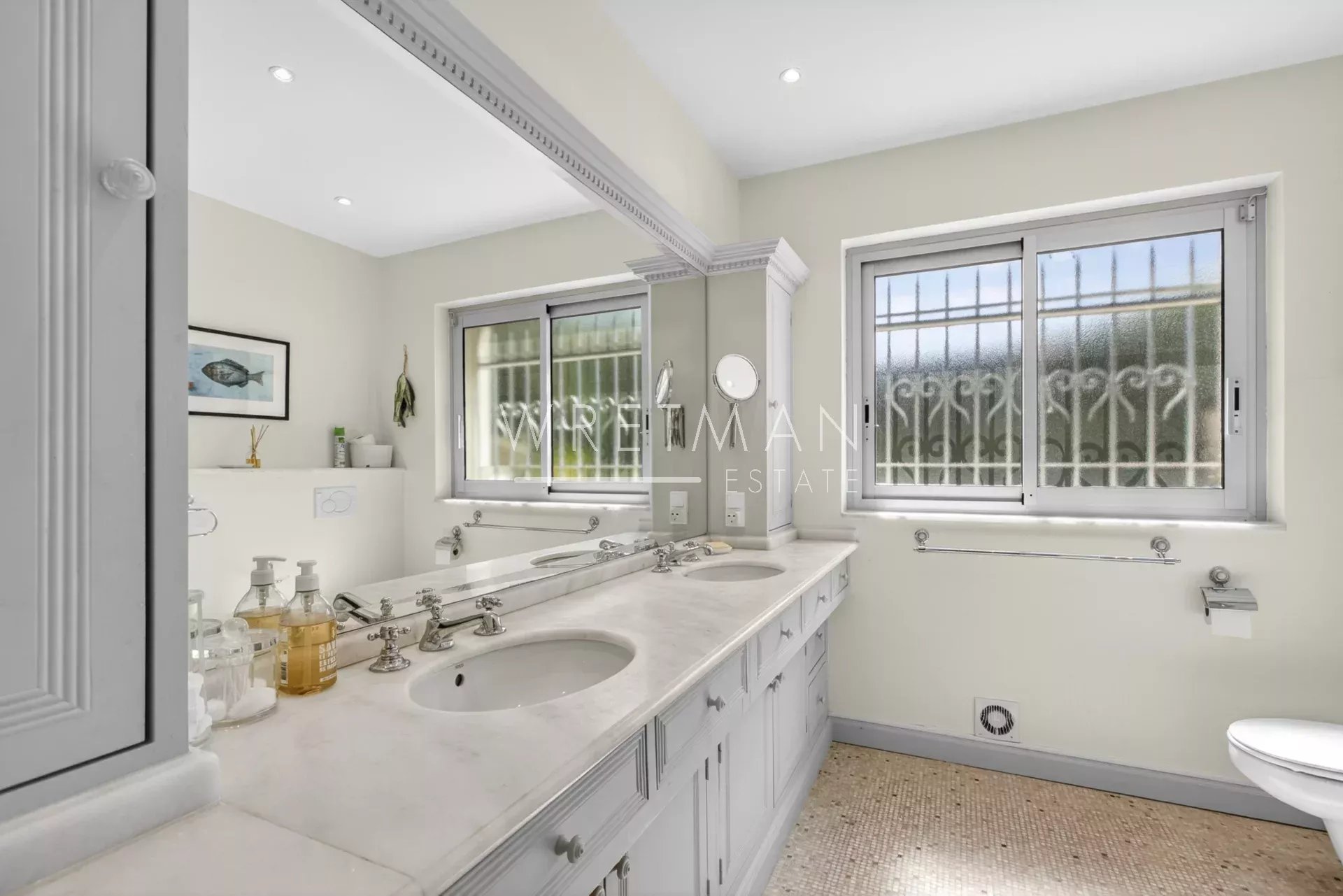 La villa est principalement de plain-pied et comprend un grand hall d’entrée, un spacieux et lumineux double salon avec cheminée, une salle à manger donnant sur l’extérieur, une grande cuisine fonctionnelle, une chambre principale avec salle de bains privative et vue sur la mer, ainsi que deux grandes chambres avec salle de bains commune.
