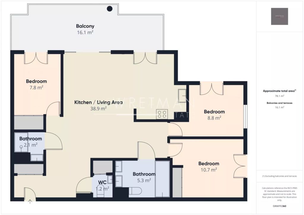 It comprises three bedrooms, each with its own balcony, two bathrooms, and an open-plan kitchen leading onto a large terrace. The apartment is fully air-conditioned.