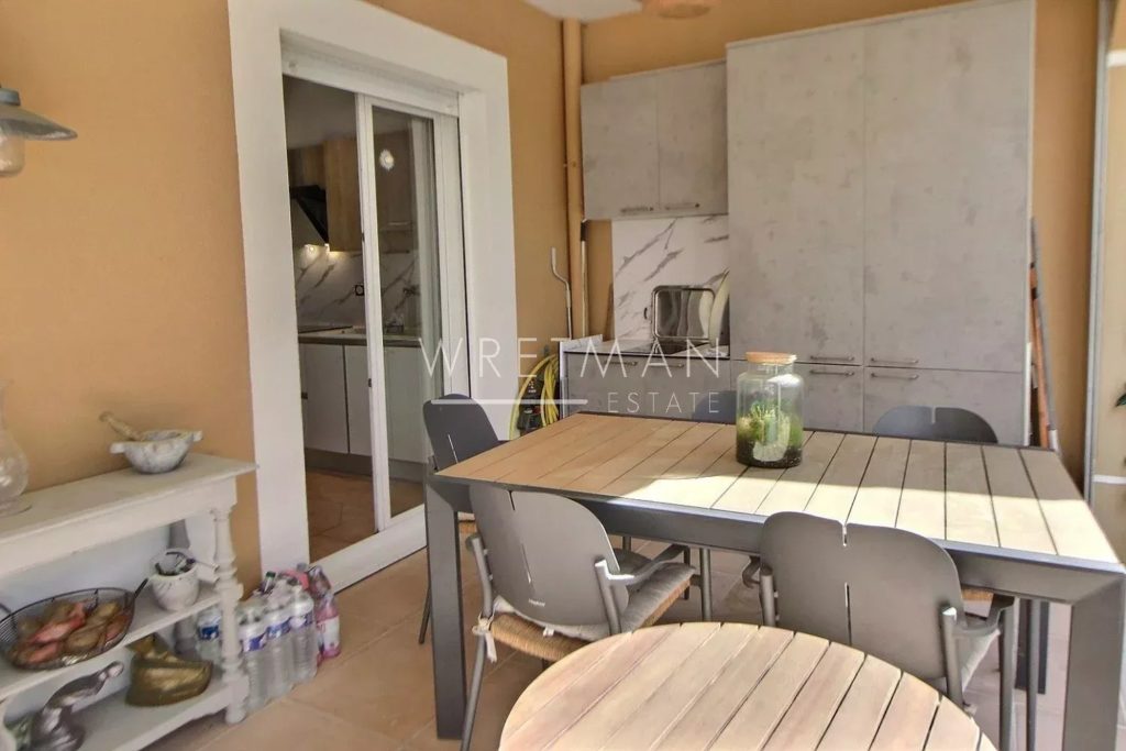 A beautiful terrace with a summer kitchen overlooking a private garden, perfect for relaxing outdoors, hosting meals, or enjoying the lush surroundings.