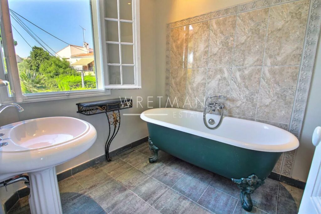 The sun-drenched garden is beautifully landscaped with Mediterranean plants and trees. including an eucalyptus. a pepper tree. and succulents. Both the house and the land enjoy an unobstructed view extending to the medieval village of Cagnes-sur-Mer.