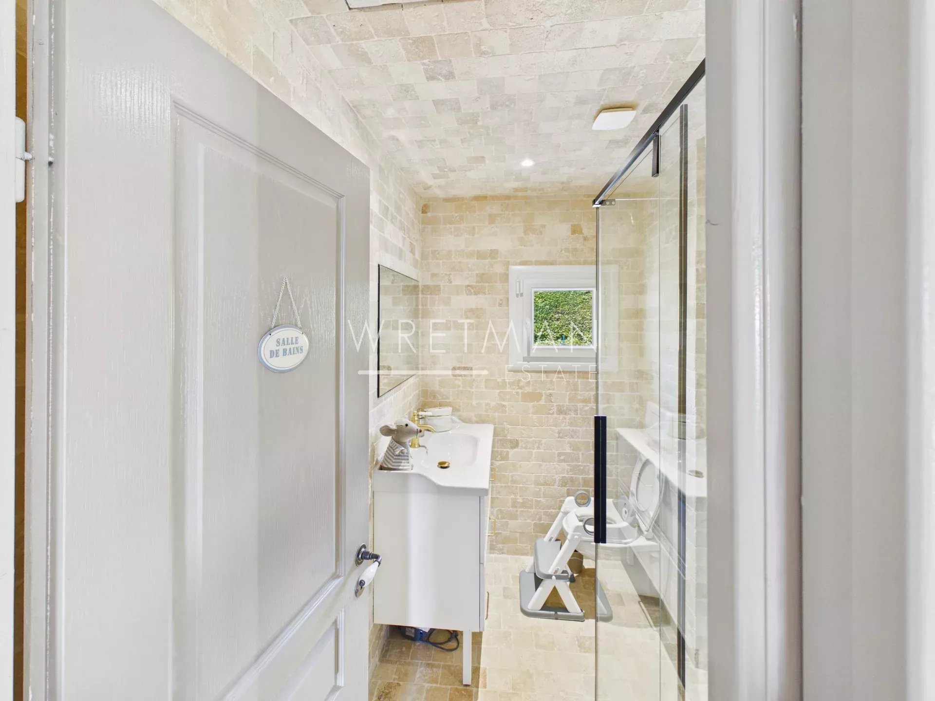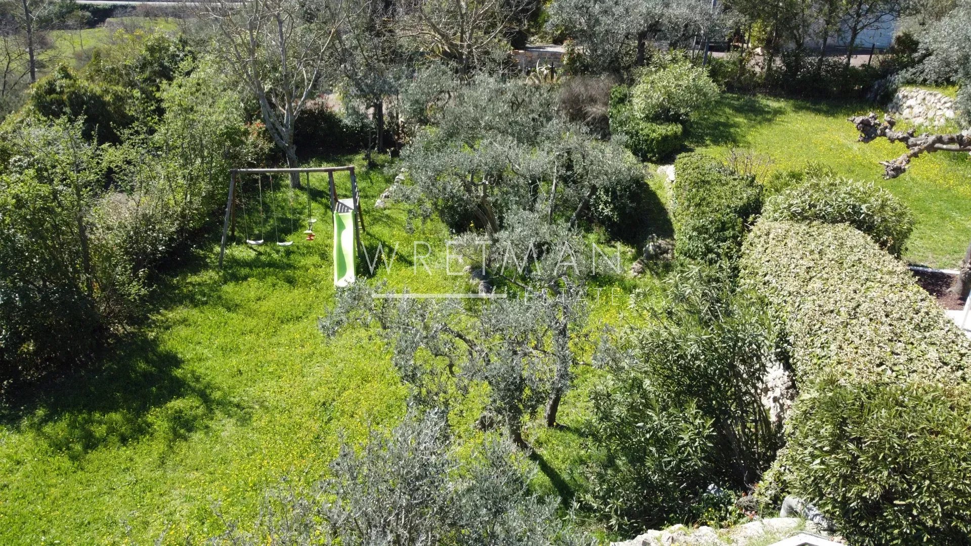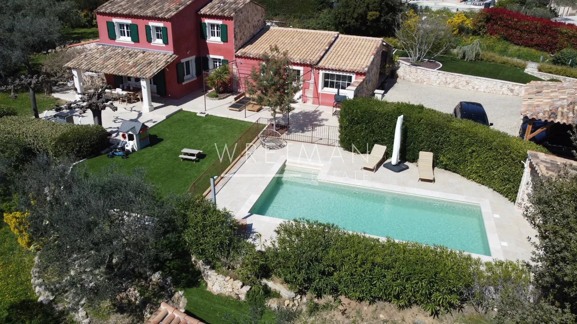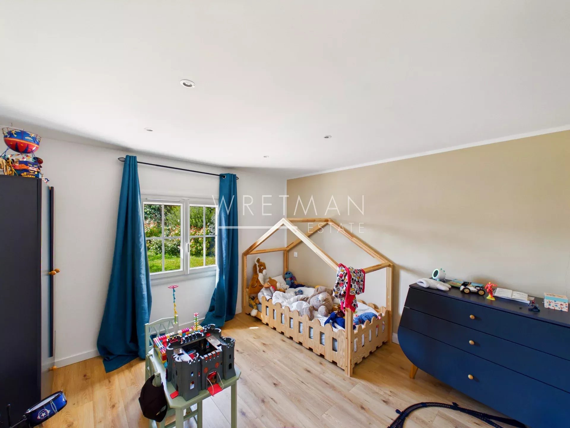The sitting room has a fire (insert), double doors onto the dining terrace, and a playroom next door.