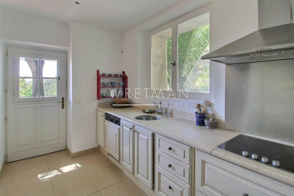 The mas features a spacious living area with large windows that flood the room with natural light, highlighting the beautiful stonework and wooden beams. The living room includes a cozy fireplace, perfect for cooler evenings, and seamlessly connects to the dining area. One of the highlights of this home is the expansive veranda, offering a perfect space for dining or relaxation while enjoying the stunning views, regardless of the weather.