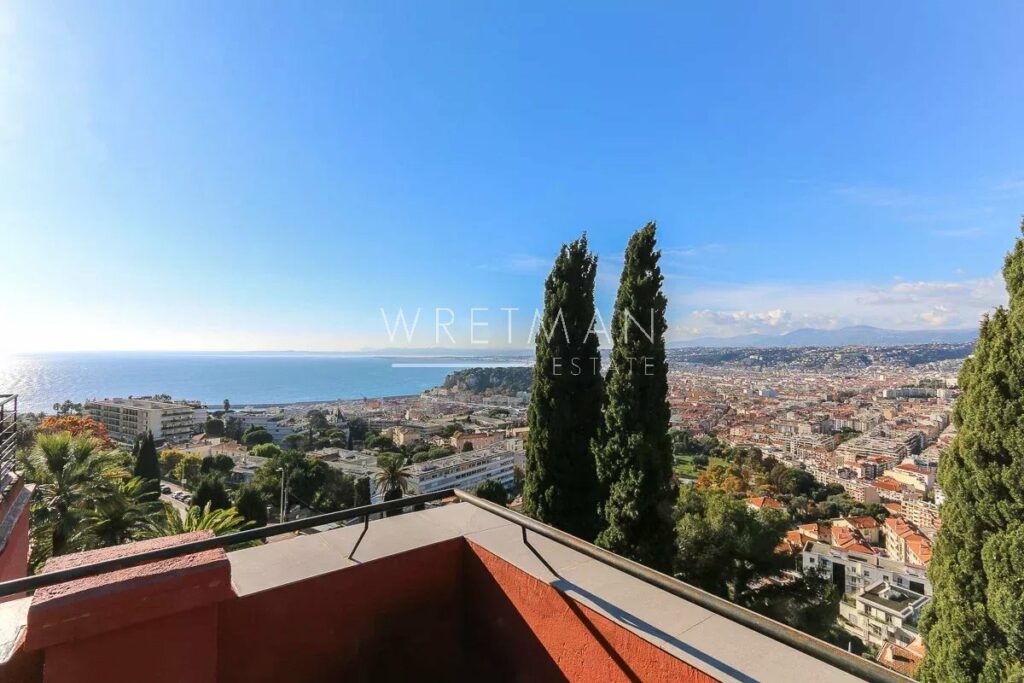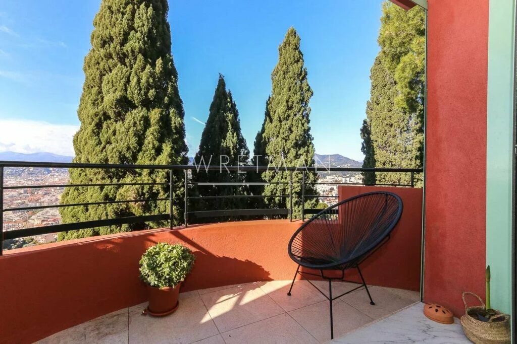 A private 70 m² (750 sq ft) rooftop terrace, accessible via an exterior spiral staircase, completes this exceptional property. A true haven of peace, it offers panoramic views of the sea, the city of Nice, and the surrounding forest.