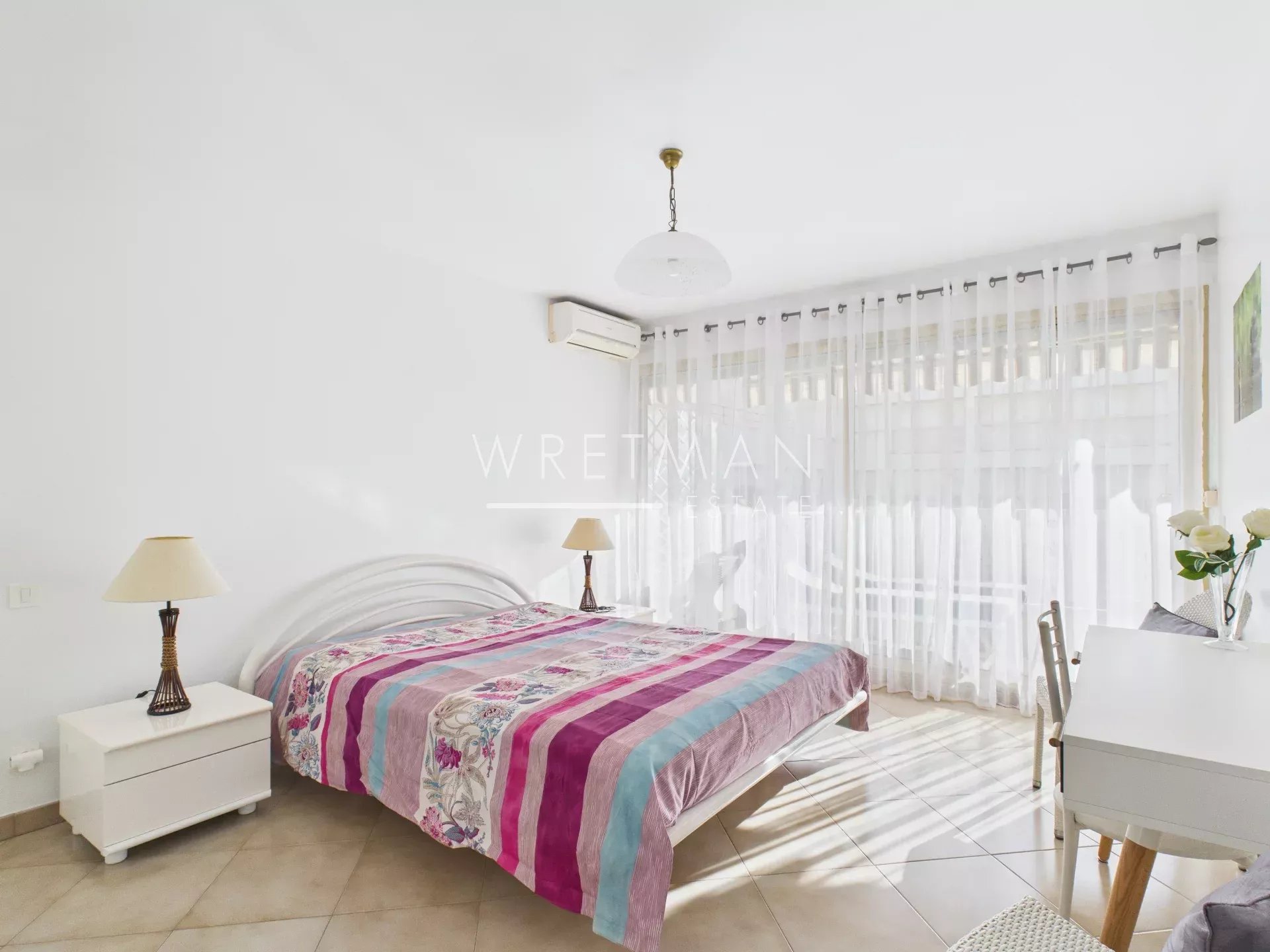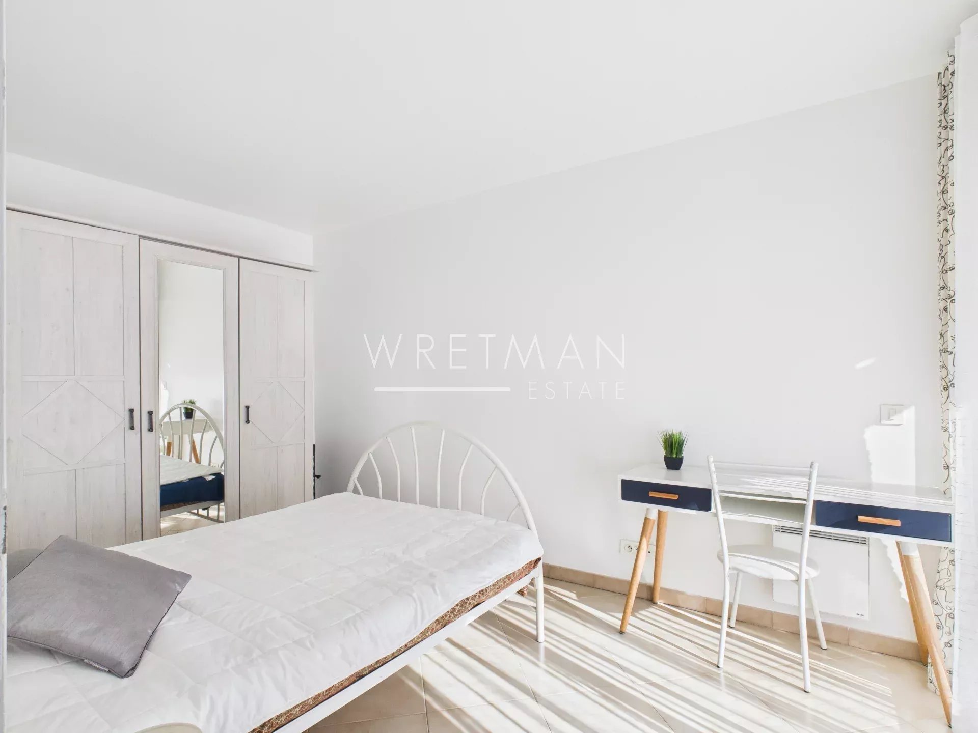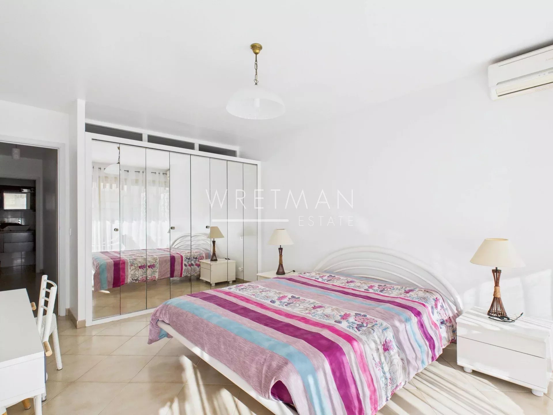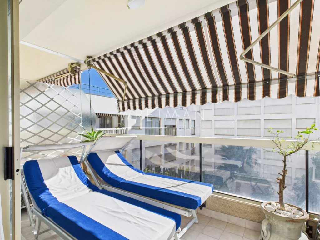 This flat comprises a living room with open kitchen and access to a large south-facing terrace, a spacious master bedroom with built-in cupboards as well as air-conditioning and access to a south-facing terrace, a second spacious bedroom with access to the terrace, and a third bedroom with built-in cupboards (with no window to the outside), a superb shower room with double washbasin, and a separate toilet.
