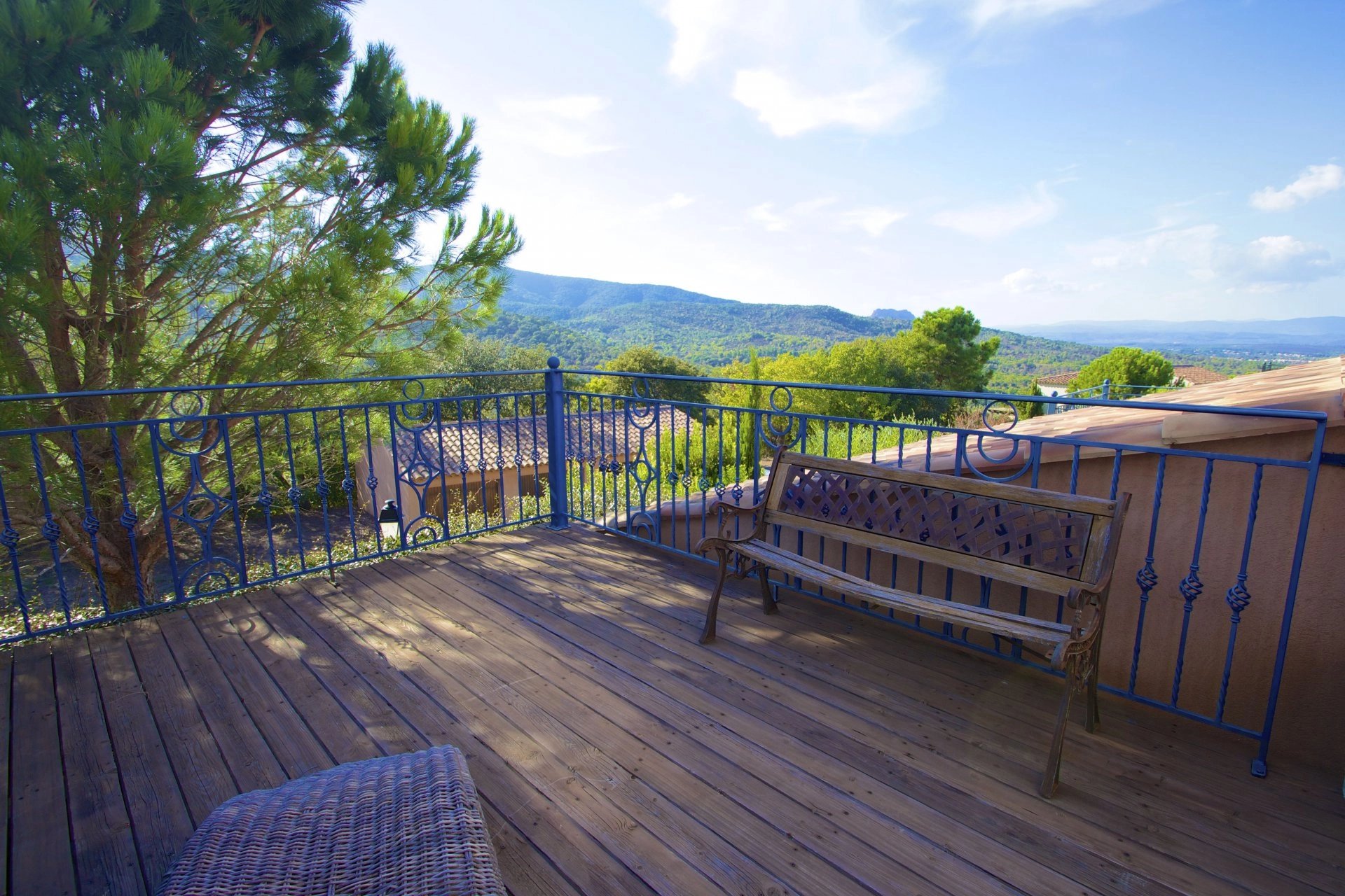 The location is good with stunning views of the Massif des Maures and only 5 minutes by car to the Mediterranean. The format is as follows: entrance hall with cupboard, toilet, bright living room with air conditioning and two side doors to the garden with partly covered terrace. There is a Provencal kitchen with appliances. The first bedroom is located on the ground floor, also with doors to the garden, and a en suite bathroom. The hallway leads a staircase to the first floor with three bedrooms. All rooms have closets and the rear bedroom has French doors to a sunny private terrace with beautiful views. Also on this floor you will find a second toilet, a modern bathroom with bath, washbasin and a 3rd bathroom with sink and shower. This property has been well maintained and is also interesting as investment for rental.