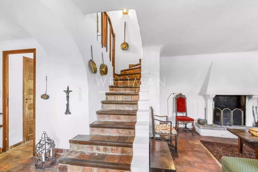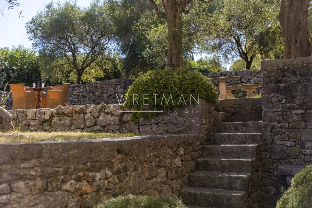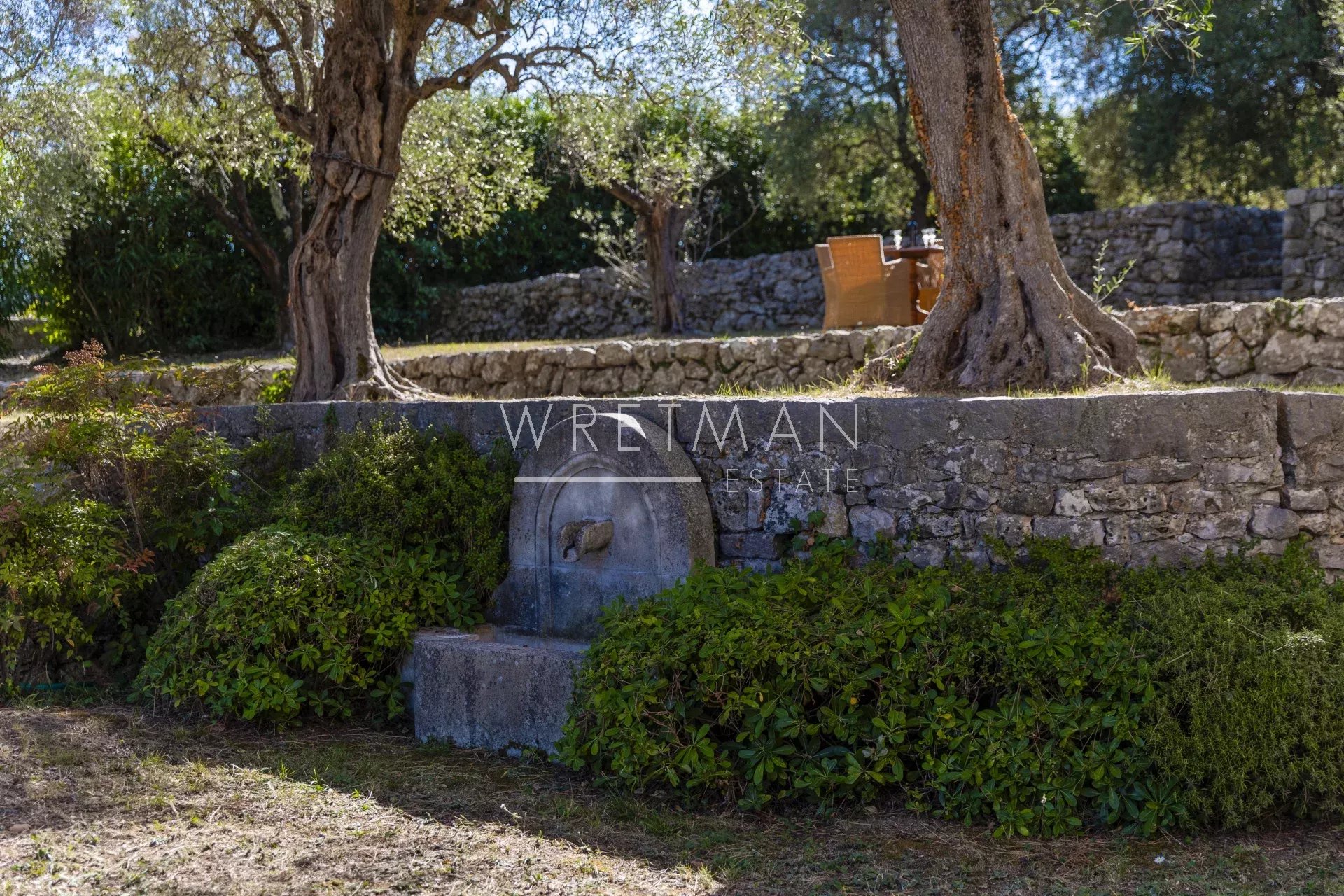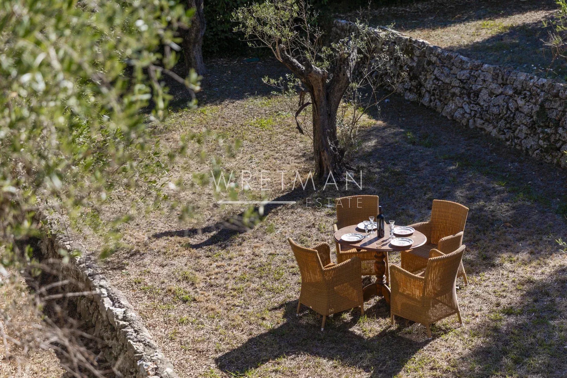 The property spans approximately 7,000 m² and features a lovely swimming pool and a beautifully landscaped garden with stone walls, several seating areas, and over 40 olive trees, some of which are illuminated in the evening. The property is very peacefully situated with unobstructed views and complete privacy. It also includes a pétanque court, double garage, and a tool shed.