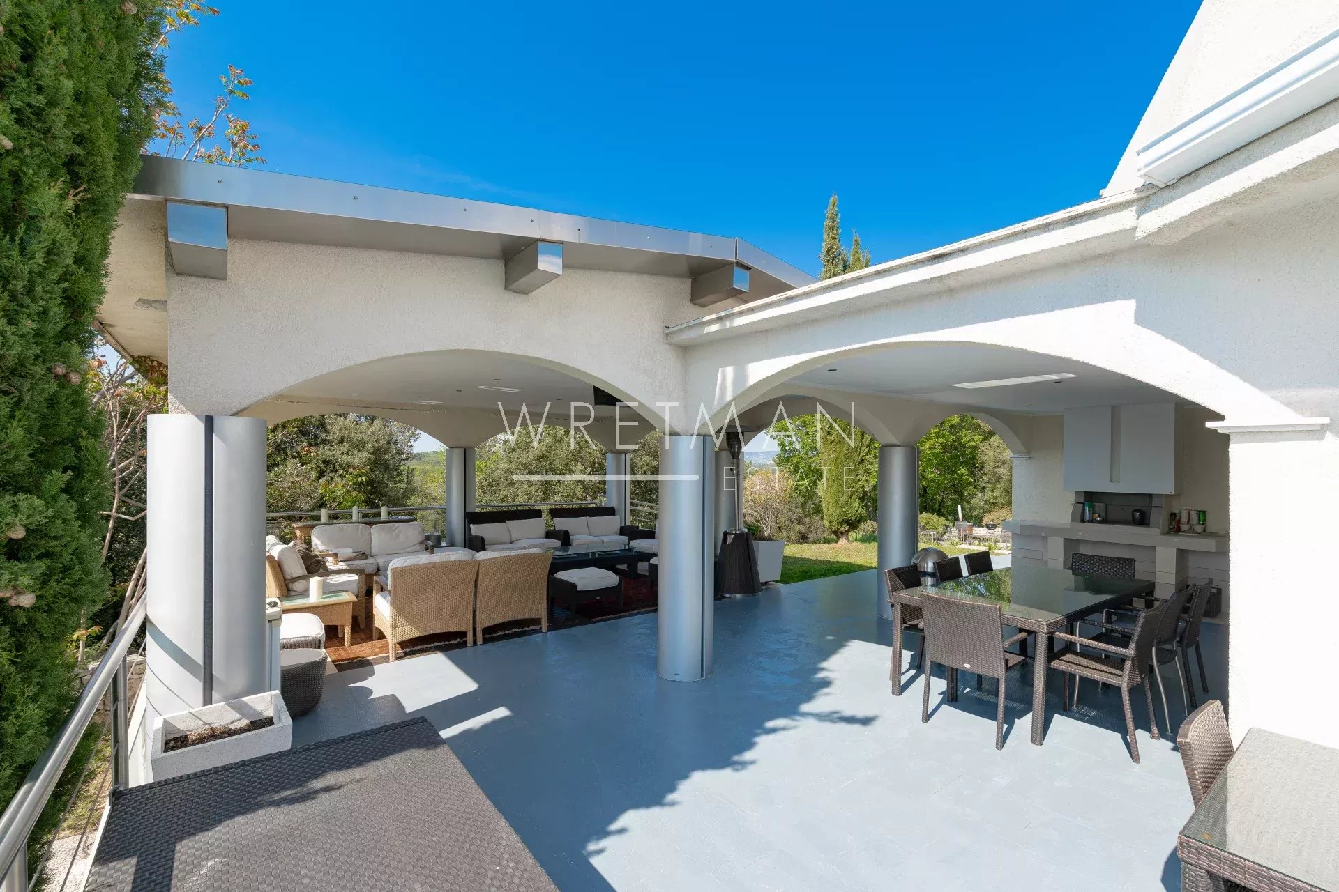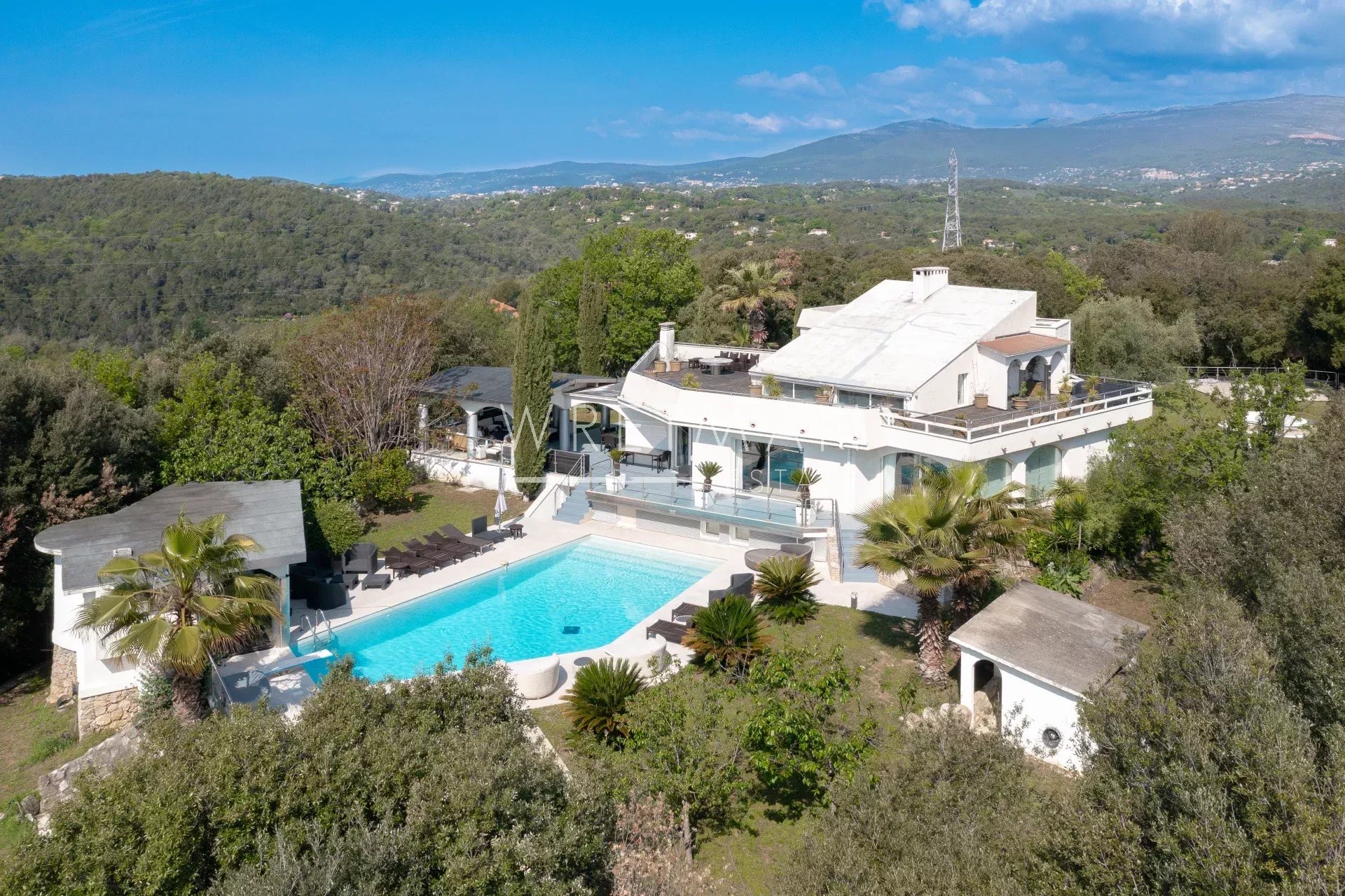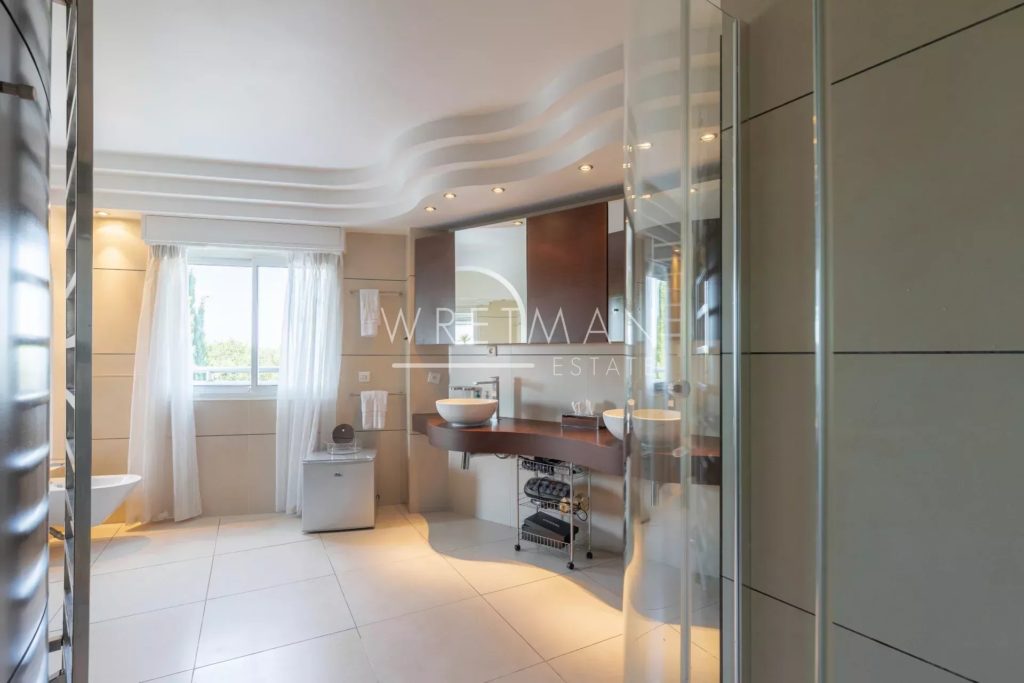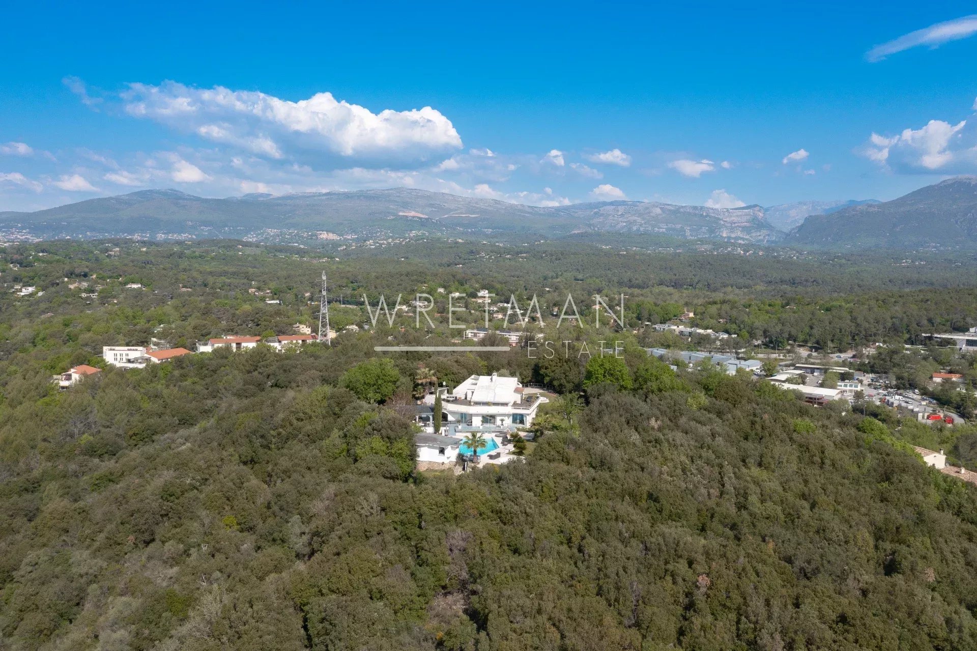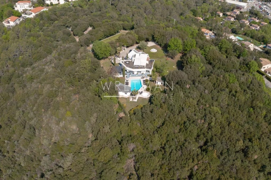 2 km from Valbonne village you find this remarkable house in an elevated position with a panoramic 360 degrees view over sea, hills and mountains. Landscaped parc with of 12000 m2 with tennis court, pool, pool-house, jacuzzi, barbecue area, helipad and a roof terrace. There is also a self contained studio flat and gardians appartement. The house has 630 m2 distributed as following, main level a big reception rooms, kitchen, 4 bedrooms, 3 bathrooms, 1 shower and boudoirs. At mezzanine level, owner’s suite and study. In the basement a home cinema, bars, 2 bedrooms, 2 bathrooms + utilities ( wine cellars, laundry…)