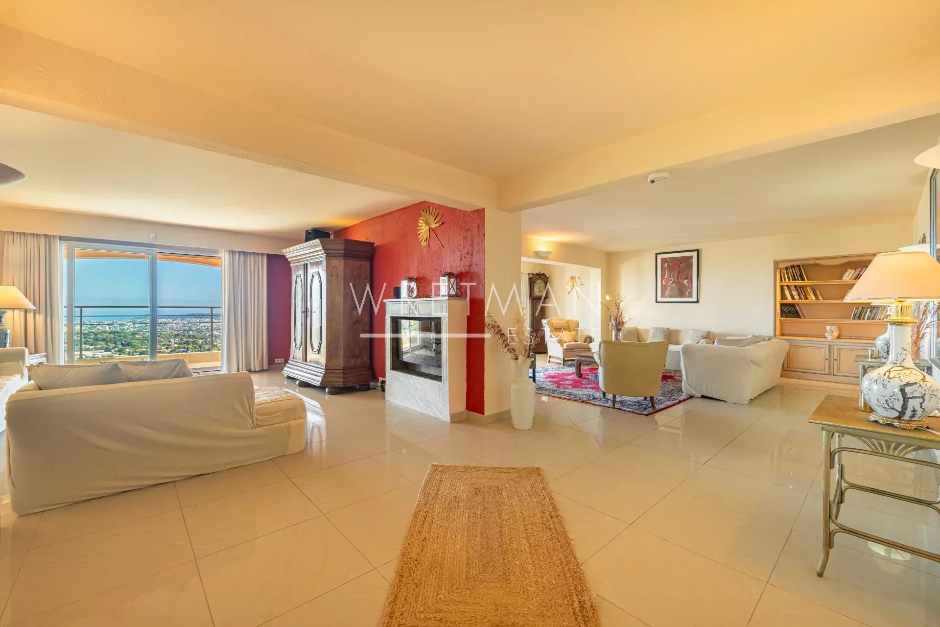 The villa, with approximately 318 m² of living space, is spread across several light-filled levels. On the main floor, a spacious double living room opens onto a large terrace with panoramic views of the sea and mountains. This level also includes a welcoming dining room, a fully equipped Provençal kitchen, and a separate apartment with two bedrooms – ideal for hosting family or guests.