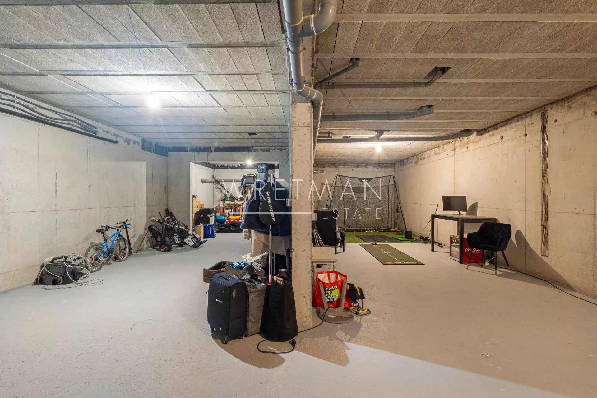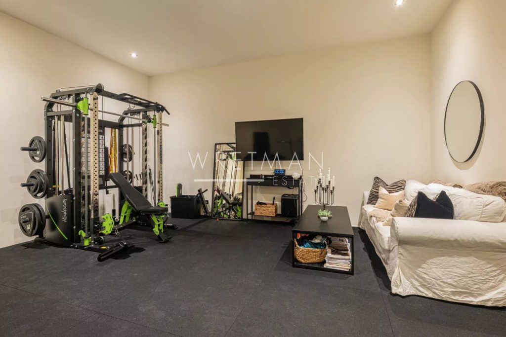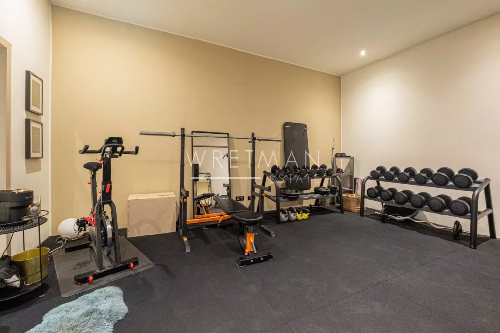 The garden level has three en-suite bedrooms, each with its own bathroom, a laundry room, a large gym, and a multipurpose space with high ceilings that can be used as a home theater, wine cellar, or storage space.