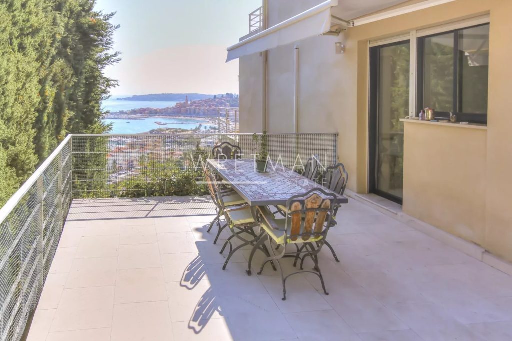Superb contemporary and bright south-facing villa with stunning views of the Mediterranean Sea and the old town of Menton. Built in year 2000 in a calm location in the sought-after Garavan area in Menton, this villa offers 208 m² of living space as well as numerous large terraces.