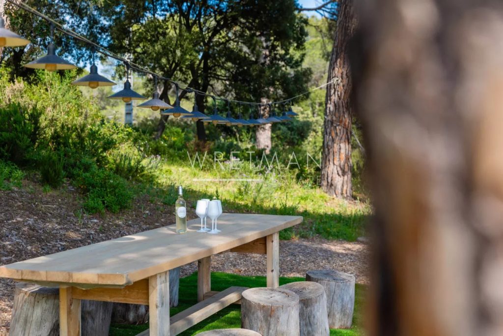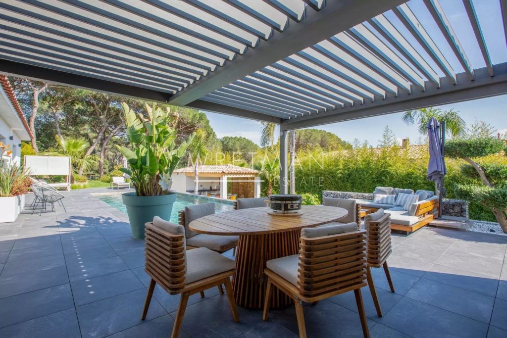 Outside, set on an enclosed plot of around 2,500 sqm with no overlooking, two distinct atmospheres come together: a landscaped and illuminated garden featuring a terrace with a bioclimatic pergola, a 10×4 saltwater pool with Balinese inspiration, several relaxation areas, and a fully equipped pool house (summer kitchen, shower, WC). This is extended by a more natural pine forest area, hosting a charming guinguette-style dining space.