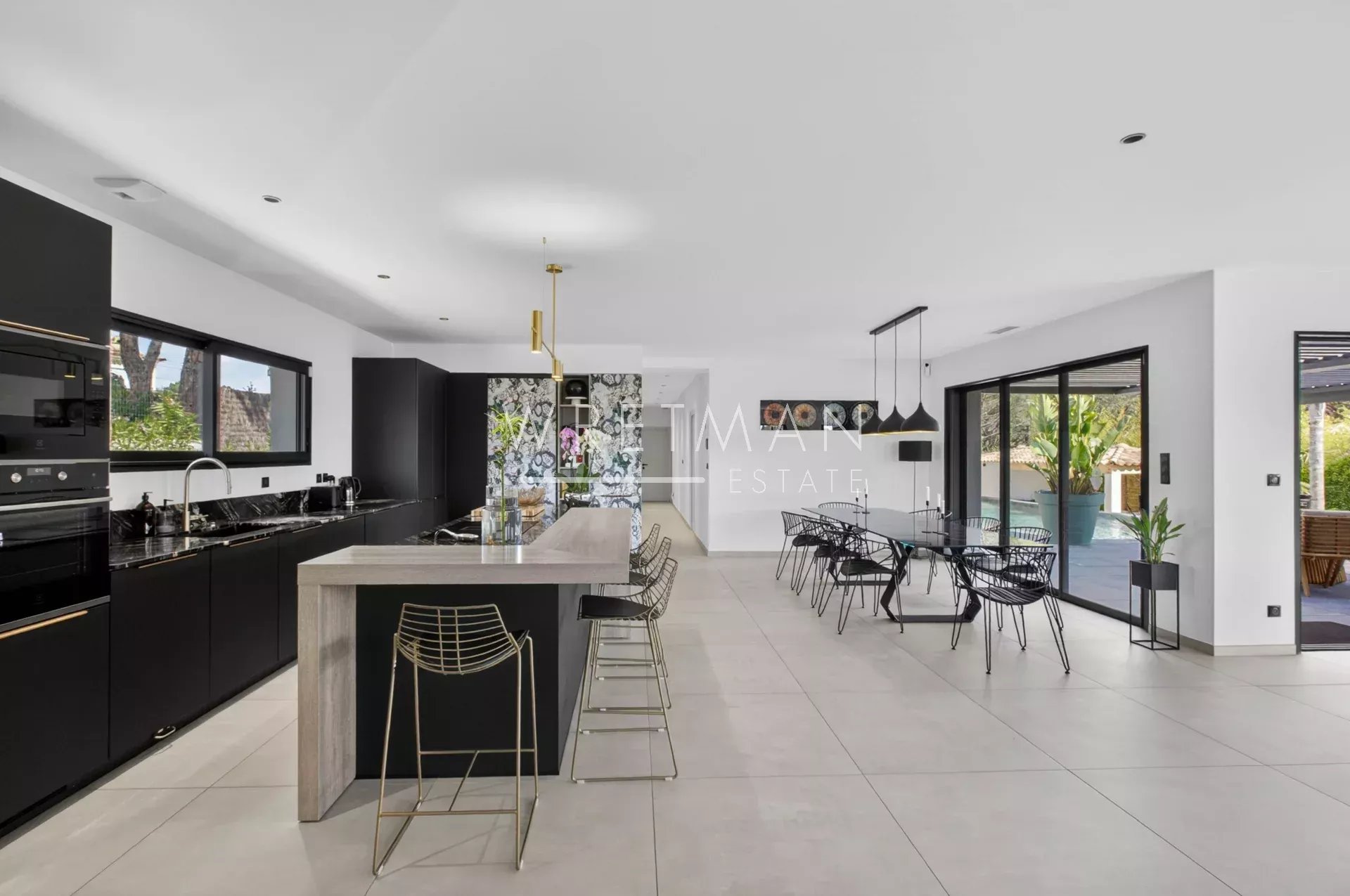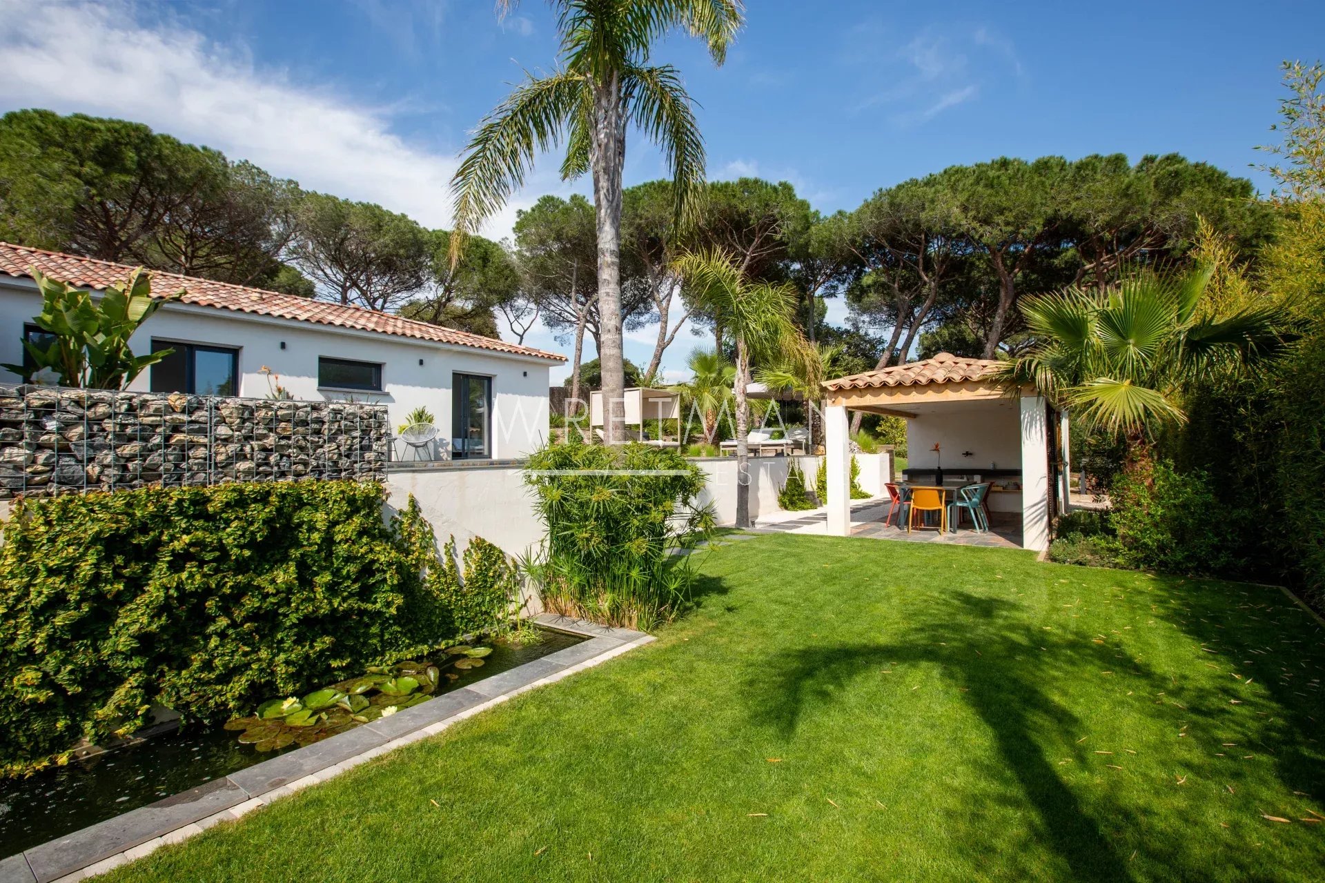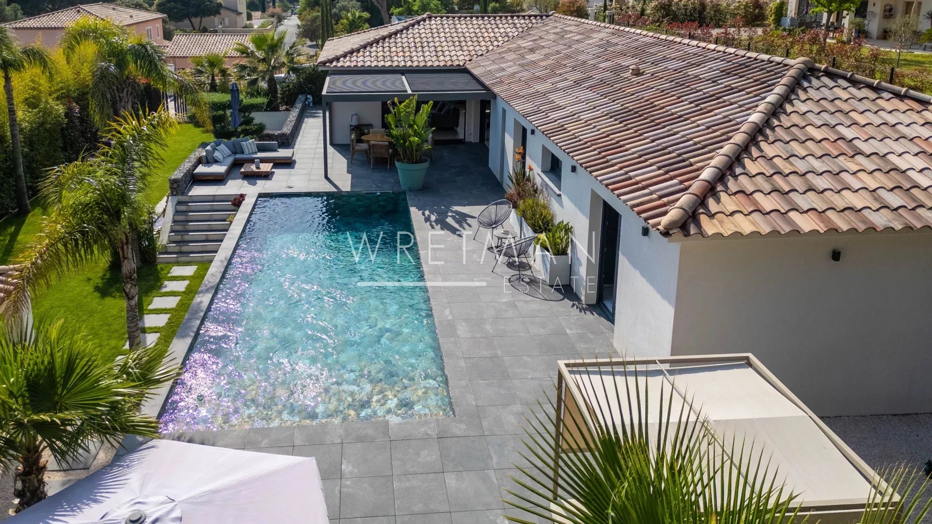 Entirely on one level, the property offers a seamless indoor-outdoor flow: all rooms open onto the garden and terraces, creating a bright and fluid living environment.