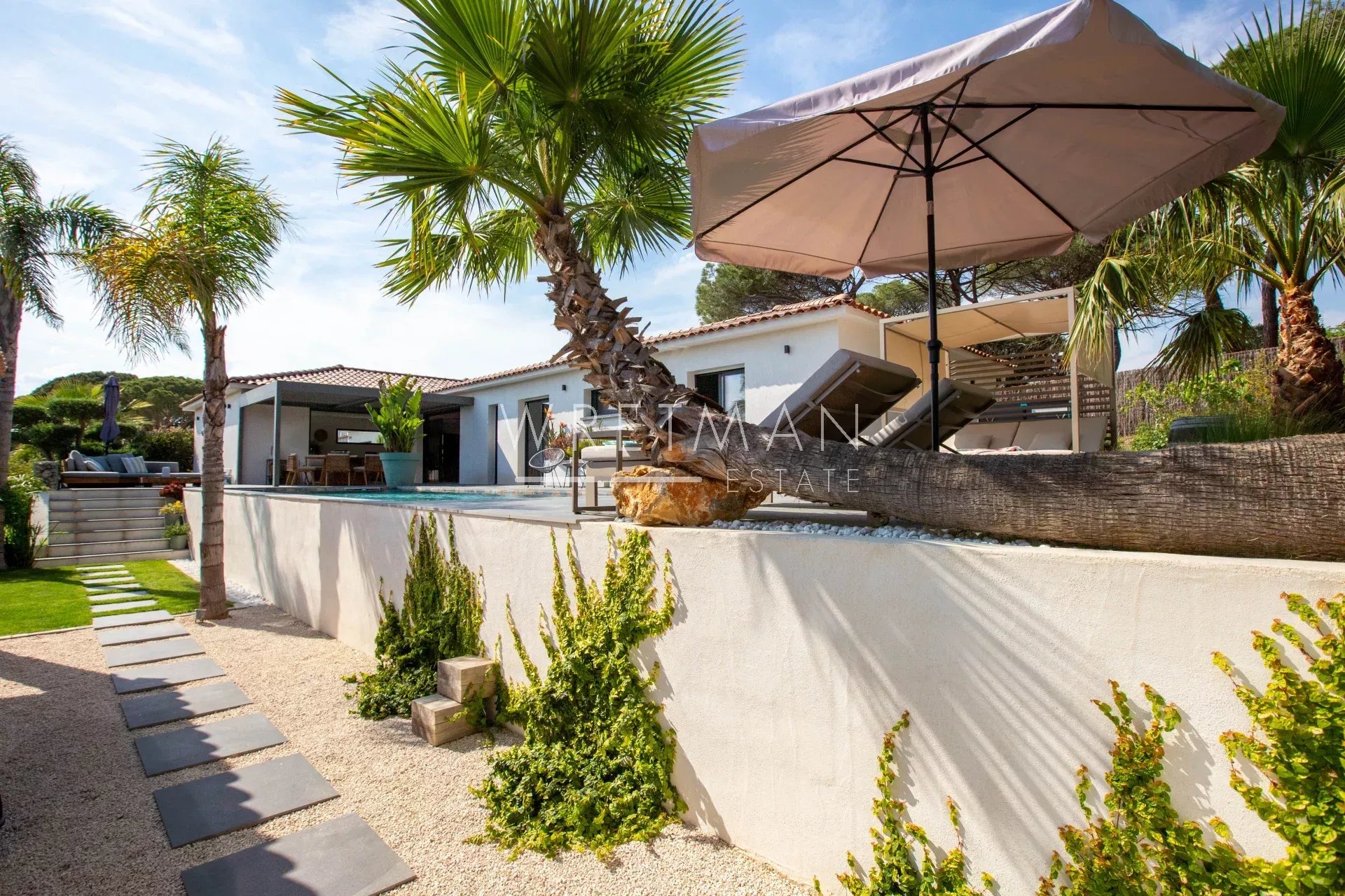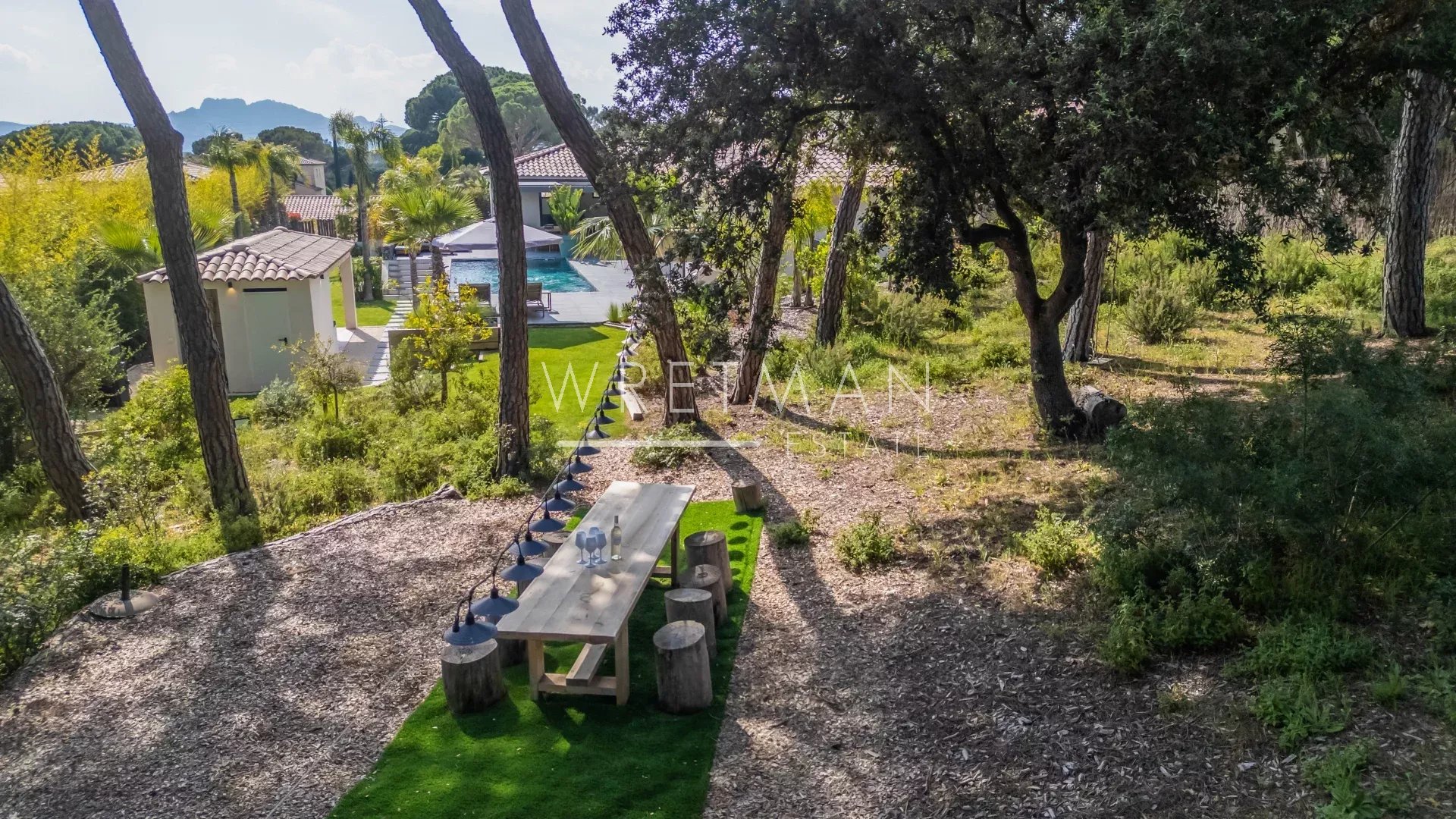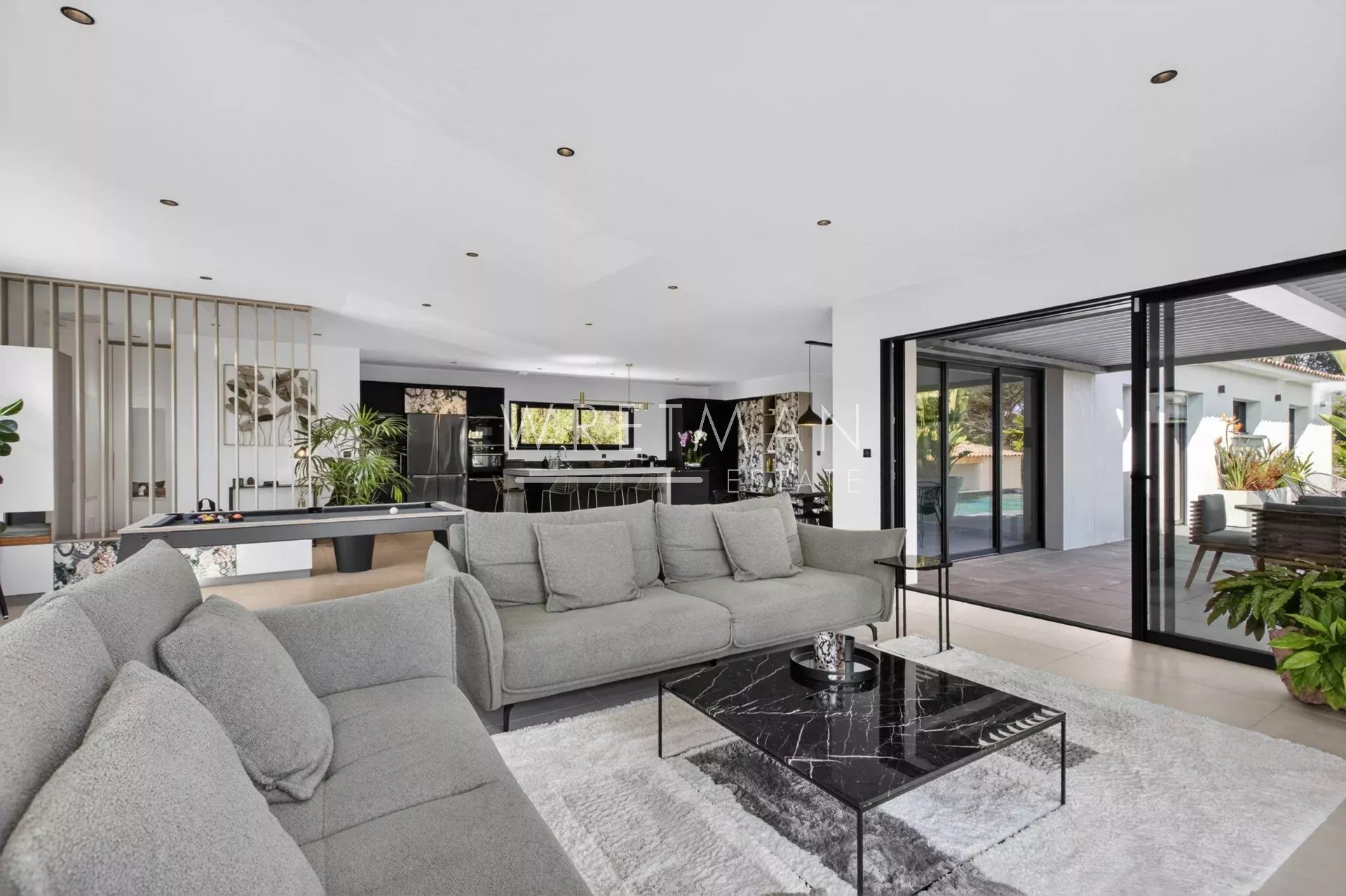 Entirely on one level, the property offers a seamless indoor-outdoor flow: all rooms open onto the garden and terraces, creating a bright and fluid living environment.