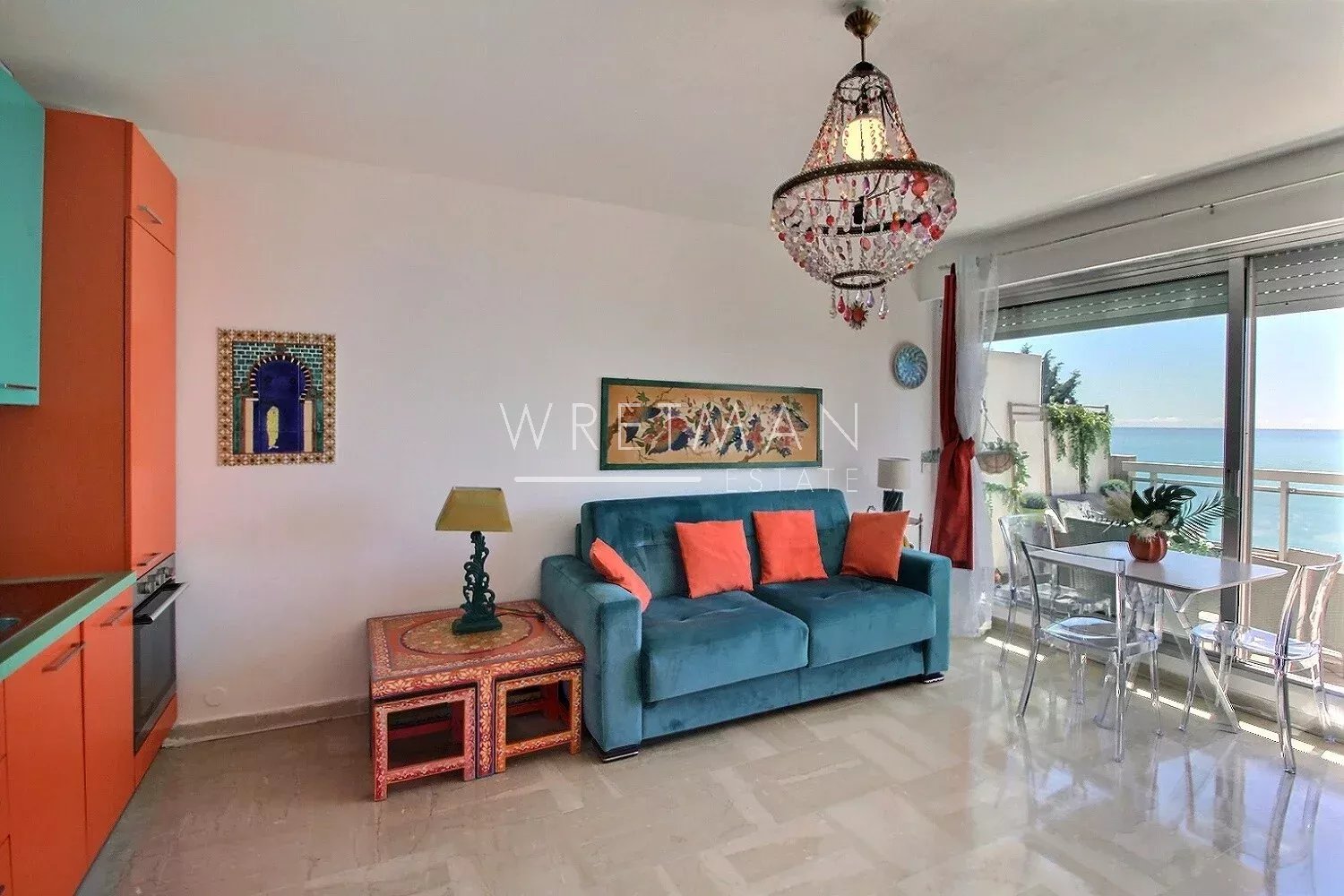 Lägenheten ligger högst upp i byggnaden med hiss och består av en entréhall, ett sovrum, ett ljust vardagsrum med ett öppet kök samt tillgång till en 7 m² stor terrass som får sol hela dagen och bjuder på en hisnande panoramautsikt över havet, den italienska gränsen och staden Menton.