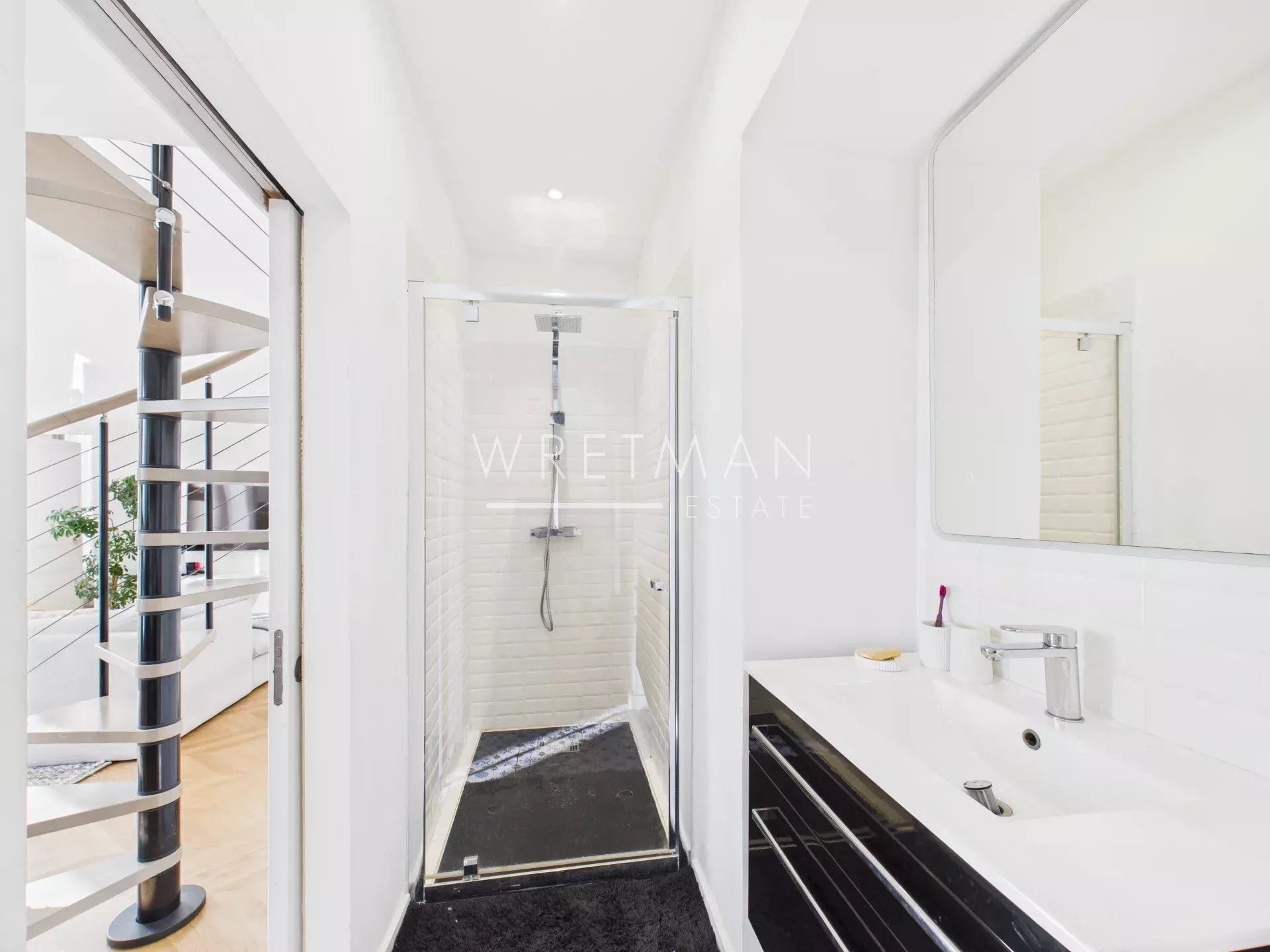 Tack vare takhöjden finns även en mezzanin med kontorshörna samt ett duschrum och toalett med eleganta ytskikt.