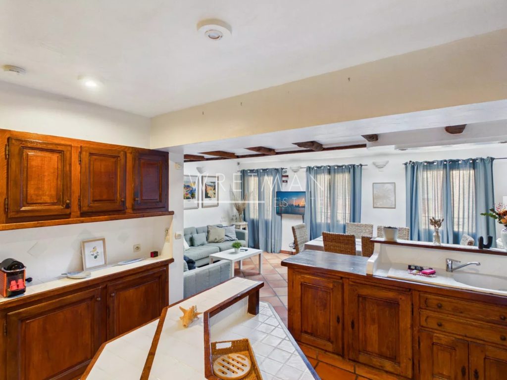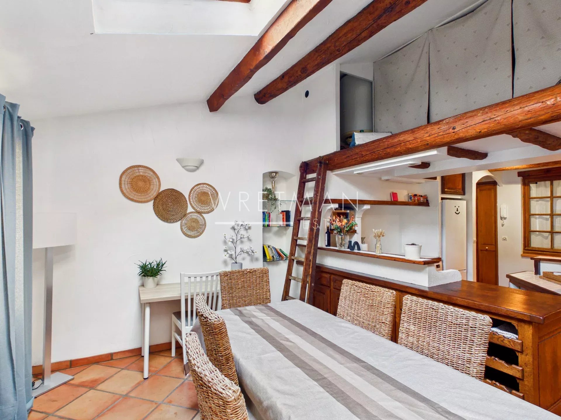Innvendig har leiligheten en stor stue med spiseplass og et fullt utstyrt åpent kjøkken. Takvinduer slipper inn vakkert naturlig lys, mens synlige trebjelker skaper en varm og innbydende atmosfære.
