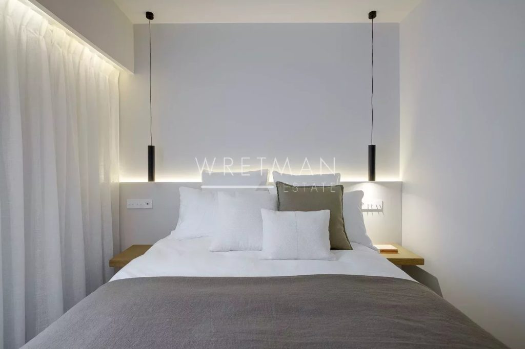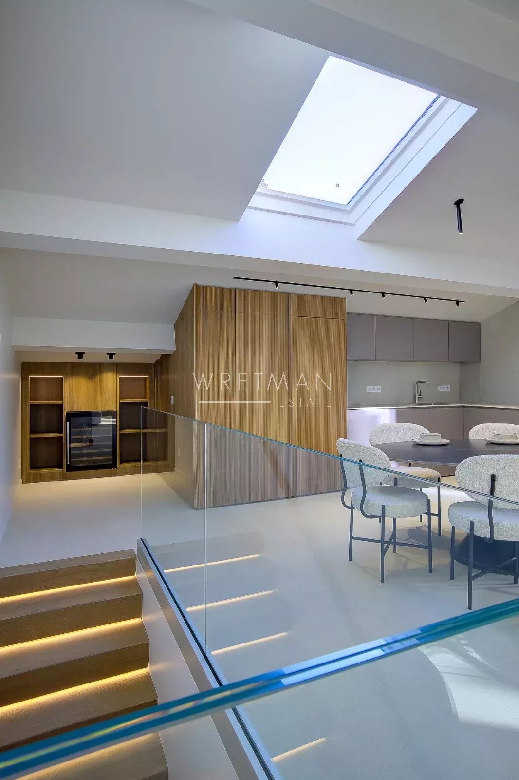 Med et areal på cirka 101 m² fordelt på to etasjer, tilbyr denne sjeldne eiendommen en romslig og lys stue med fullt utstyrt åpen kjøkkenløsning, som åpner ut mot en stor terrasse. Denne utendørsplassen fungerer som en naturlig forlengelse av innemiljøet, med flere loungeområder og et utekjøkken — perfekt for å ta imot gjester i en stilfull og avslappet atmosfære.