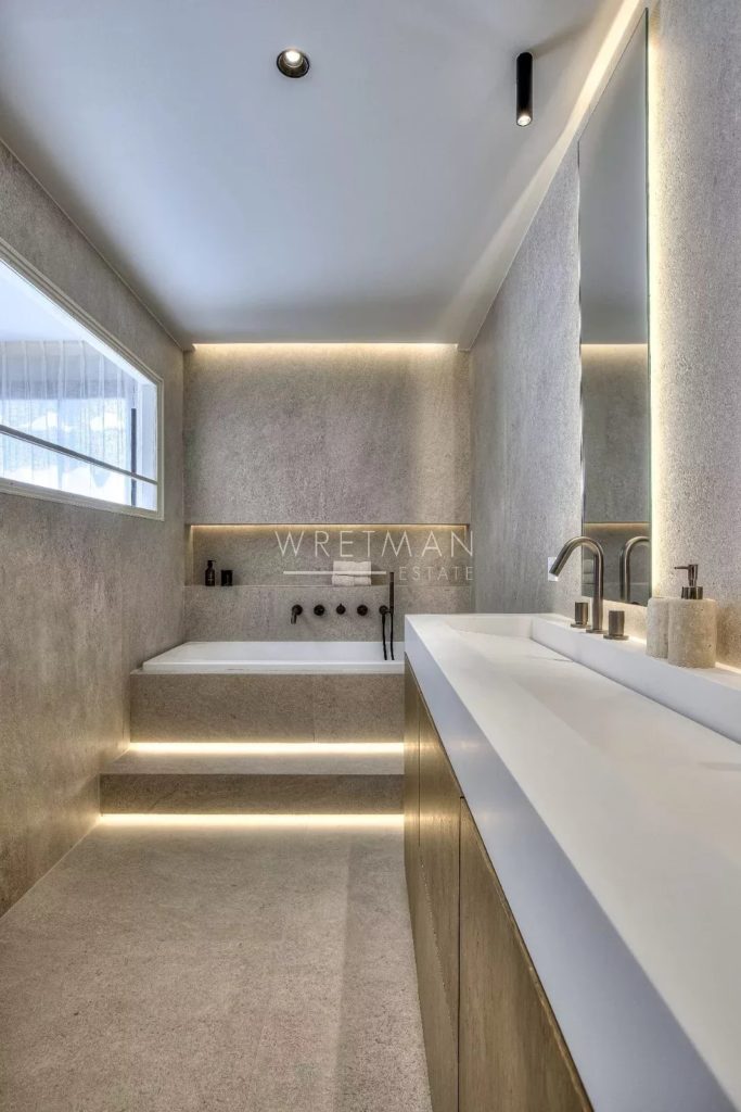 Nedre plan er viet til soveområdet og består av tre soverom, alle med tilgang til terrasse eller balkong. Hovedsoverommet har eget bad med badekar, dusj og dobbel servant. De to andre soverommene har hvert sitt private dusjbad. To separate toaletter kompletterer denne etasjen.