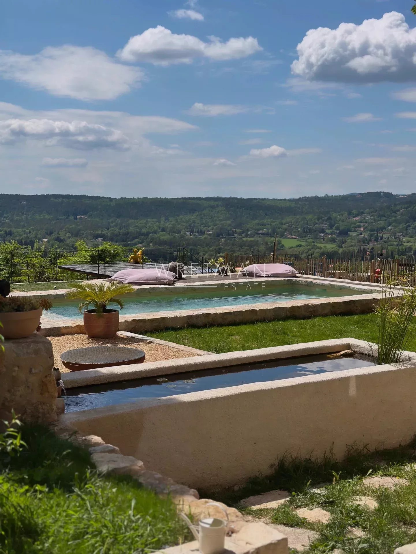 Outside, the 1,000 m² plot features a beautiful stone pool with panoramic views, a pool house, a vegetable garden, and a carport for two vehicles.