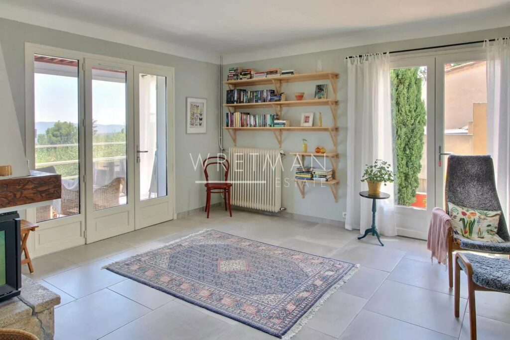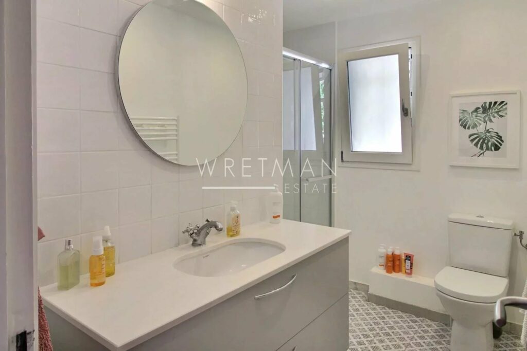 Entre, large bright living room, small veranda, dining room, newly renovated fitted kitchen with access to a large covered terrasse. A master bedroom with cupboards and shower room with toilet is also situated on the entrance level.