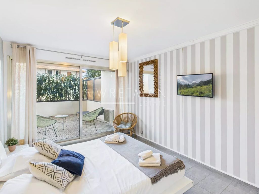 Belägen på första våningen i en säker fastighet, endast 50 meter från stranden, mitt i det livliga hjärtat av Juan-les-Pins.