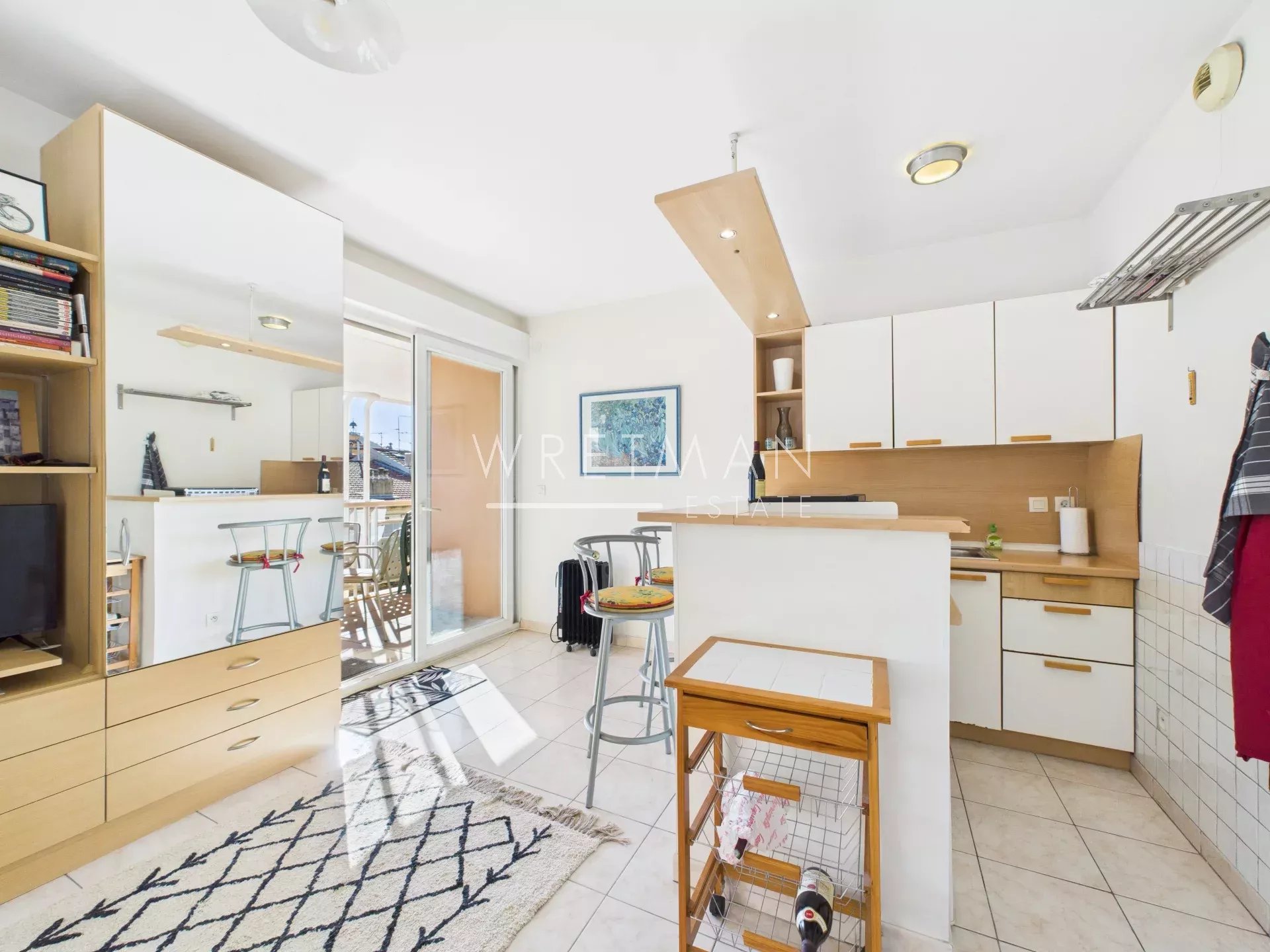 På sjätte och översta våningen i en byggnad med hiss ligger denna ljusa och funktionella studio med en rymlig terrass som erbjuder utsikt över det charmiga hamnområdet och en glimt av havet.