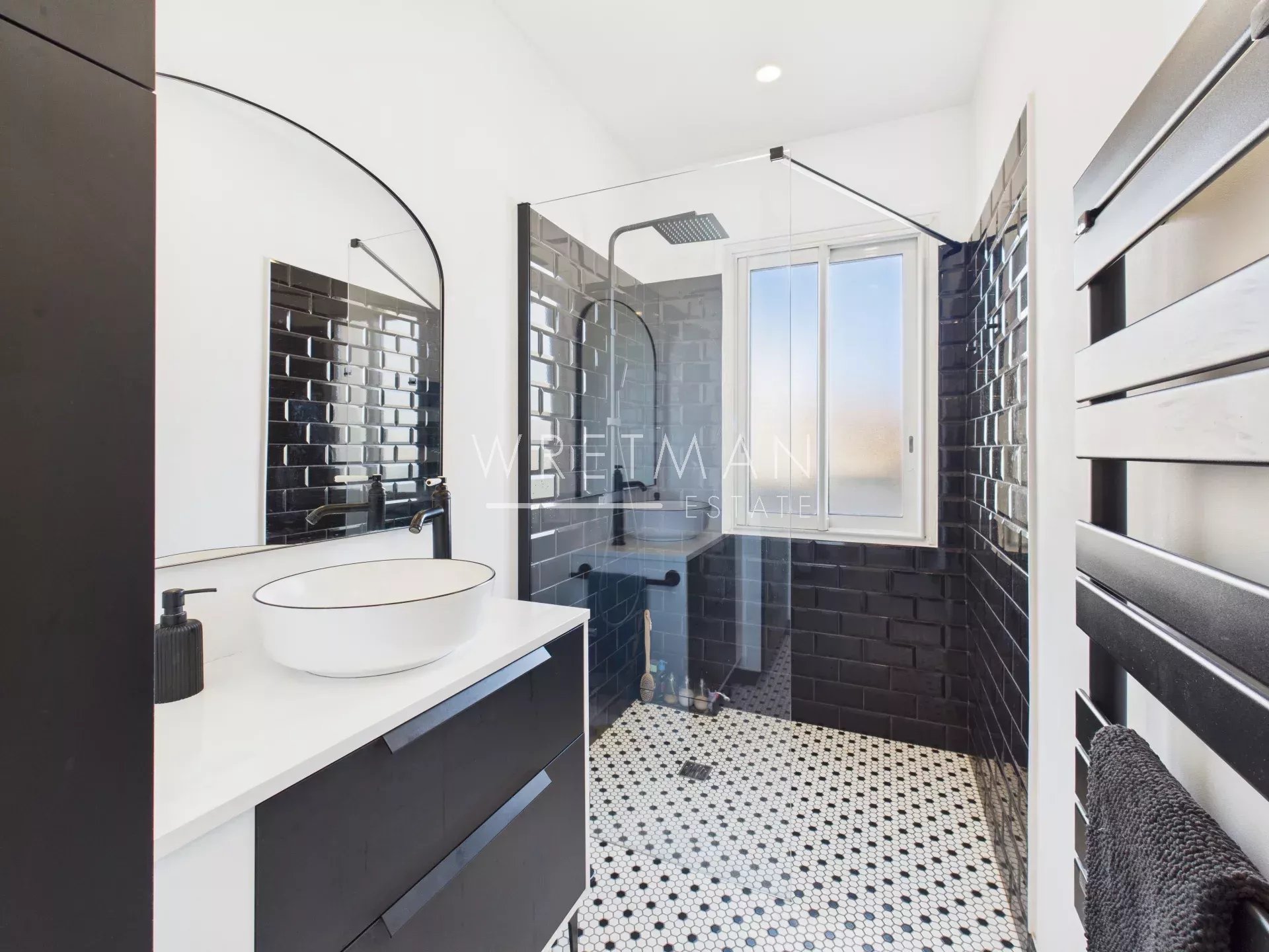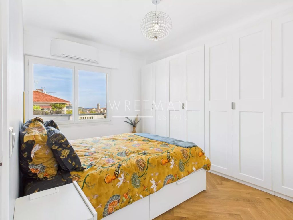 Från alla rummen samt från den härliga terrassen på ca 14 m² njuter du av en vacker vy över hustaken i Antibes, glimtar av havet och bergen i bakgrunden. Säljes med källarförråd.