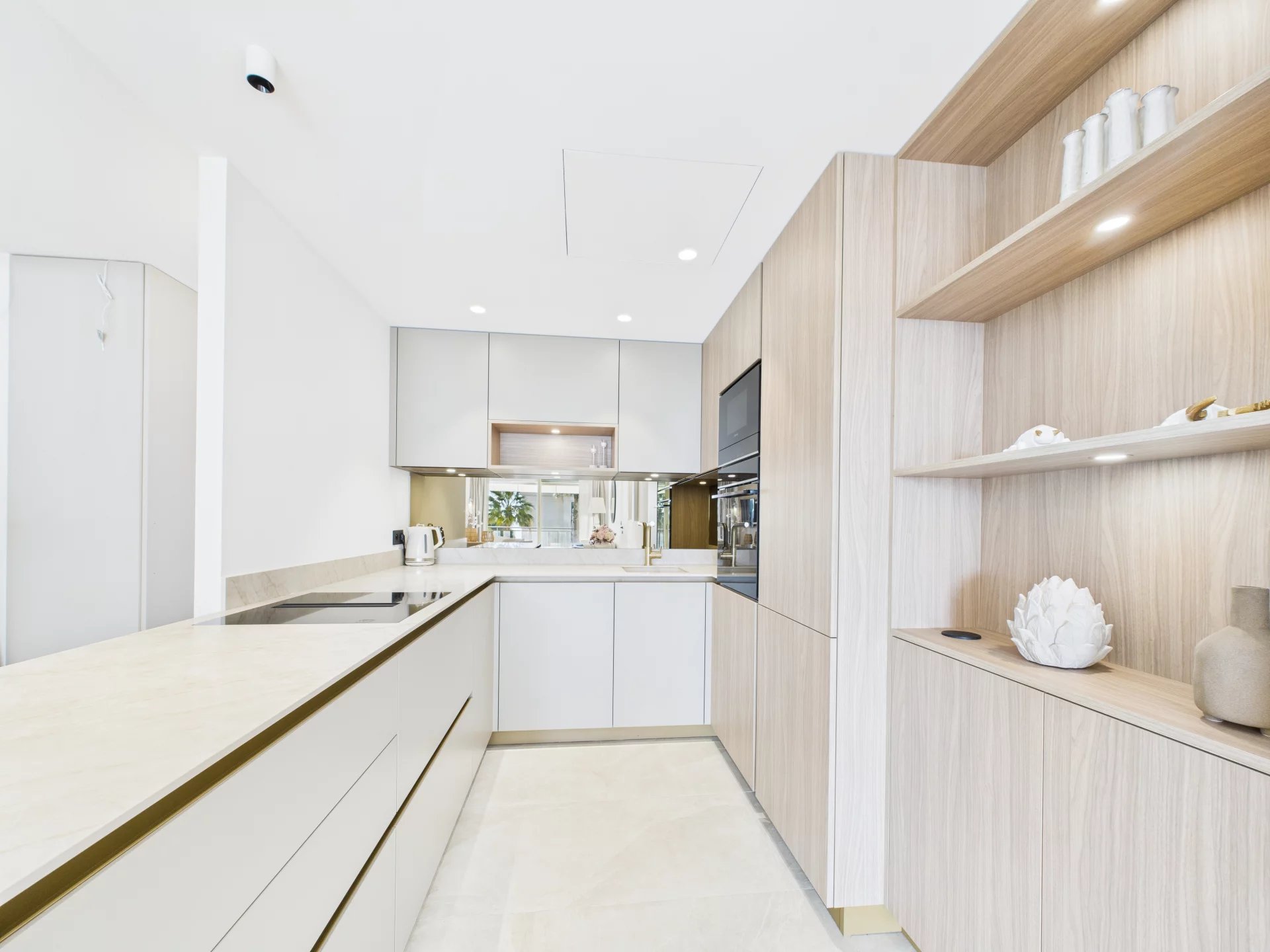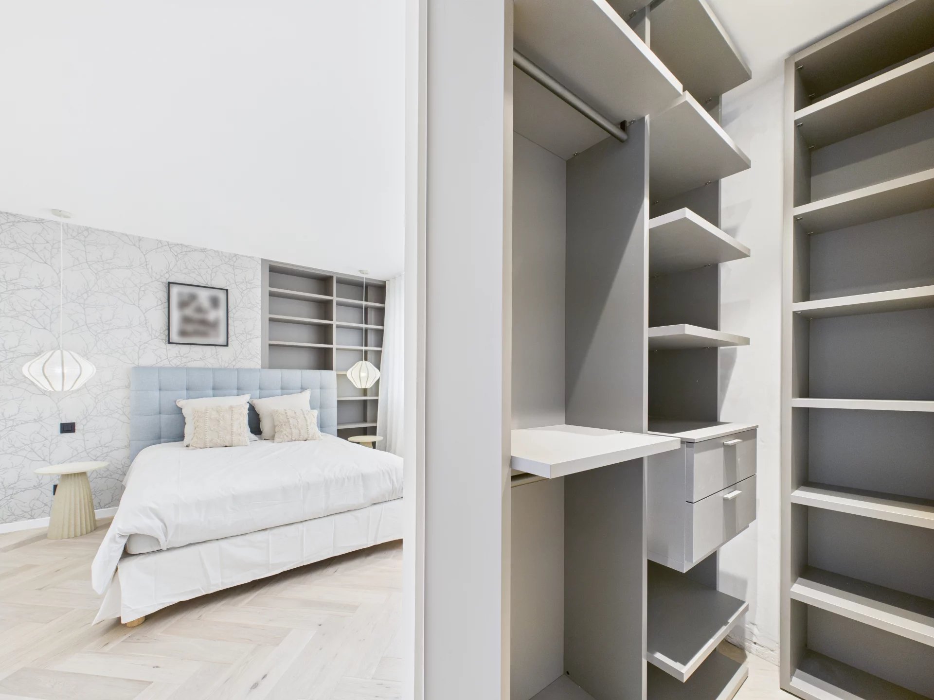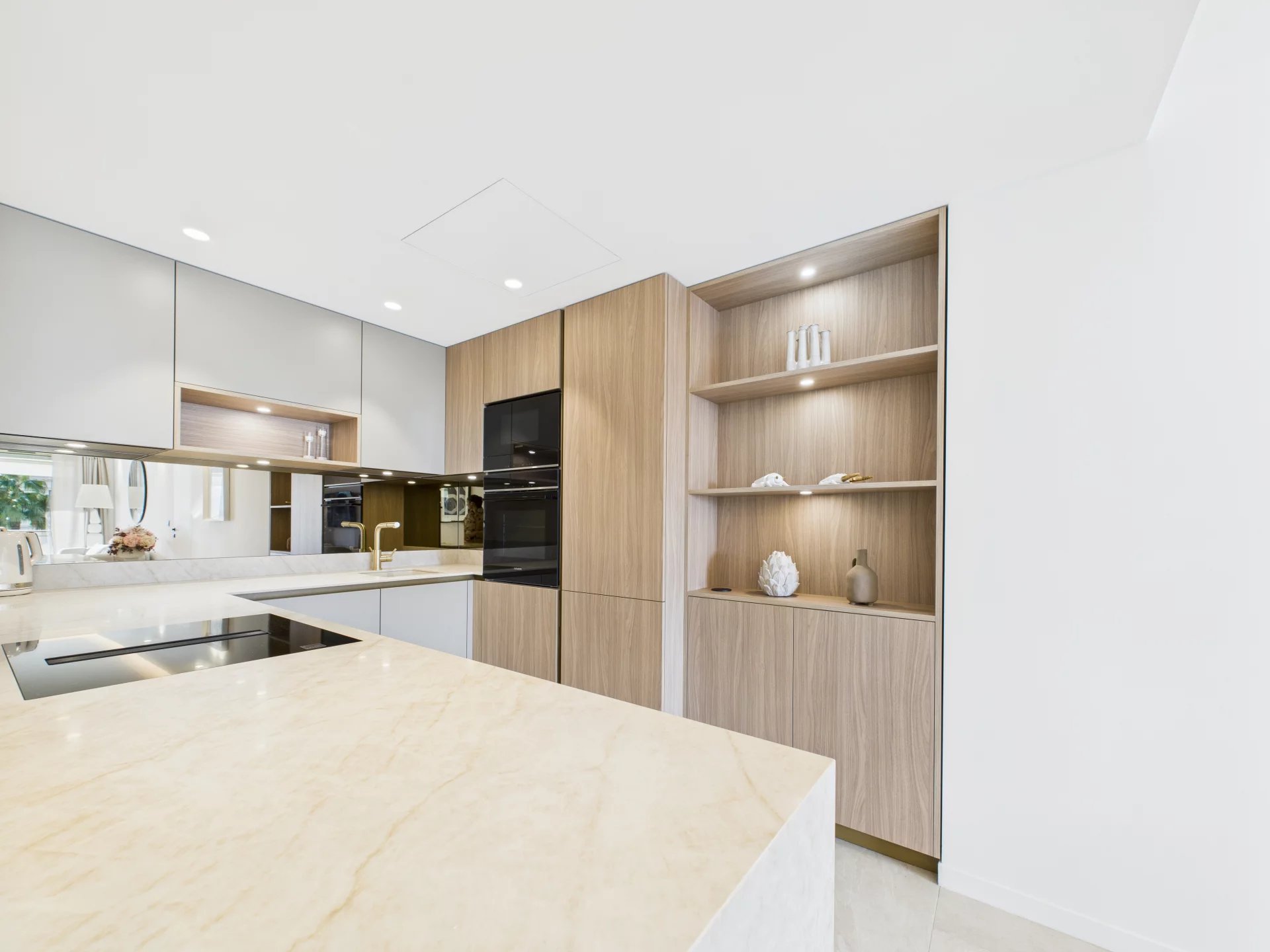 Denna magnifika lägenhet på andra våningen har totalrenoverats med högkvalitativa material och består av en hall, ett ljust vardagsrum med matplats och ett inrett och utrustat kök. Vardagsrummet vetter mot en terrass på 12,35 m² med fri utsikt över havet och parken.