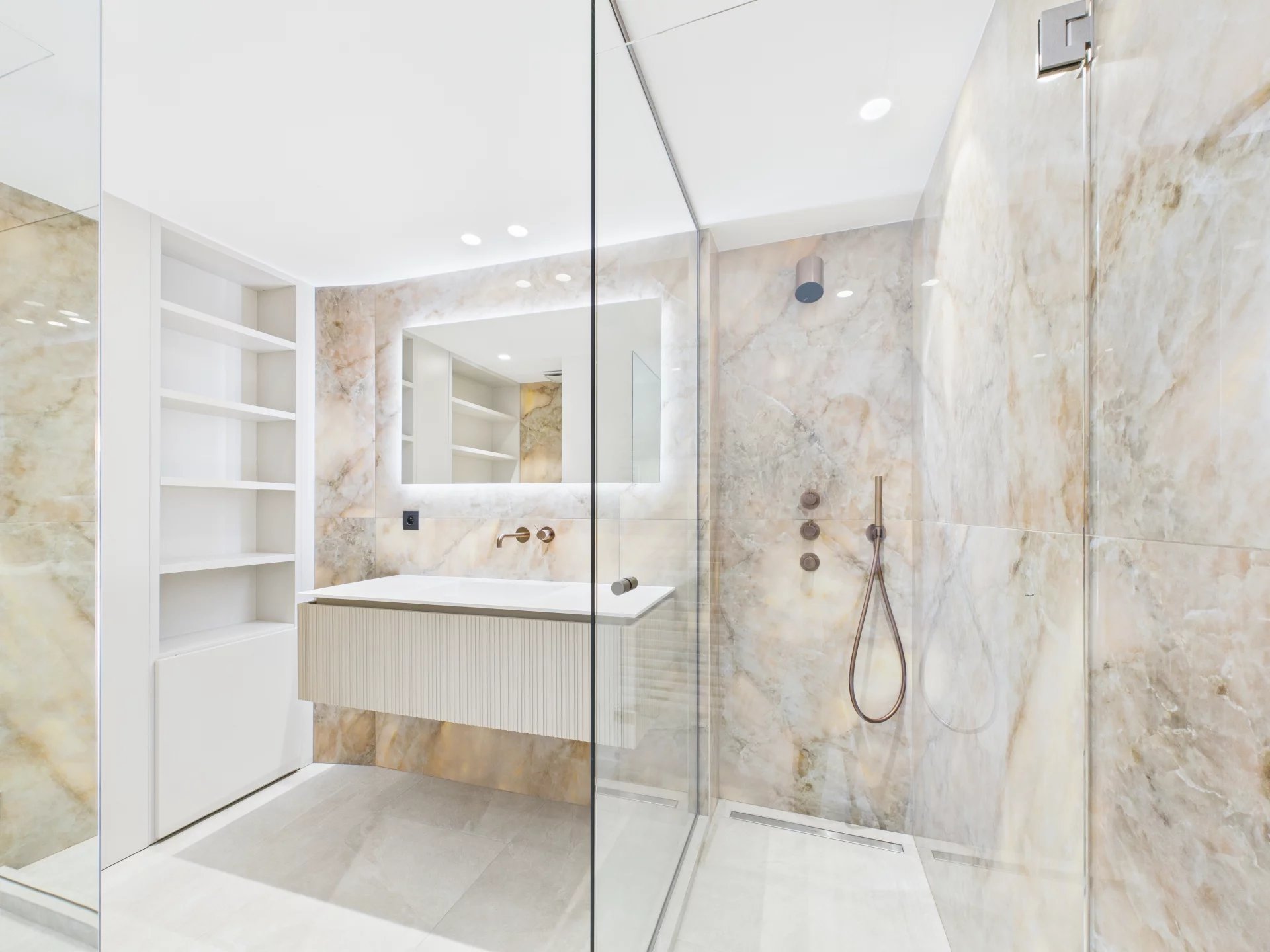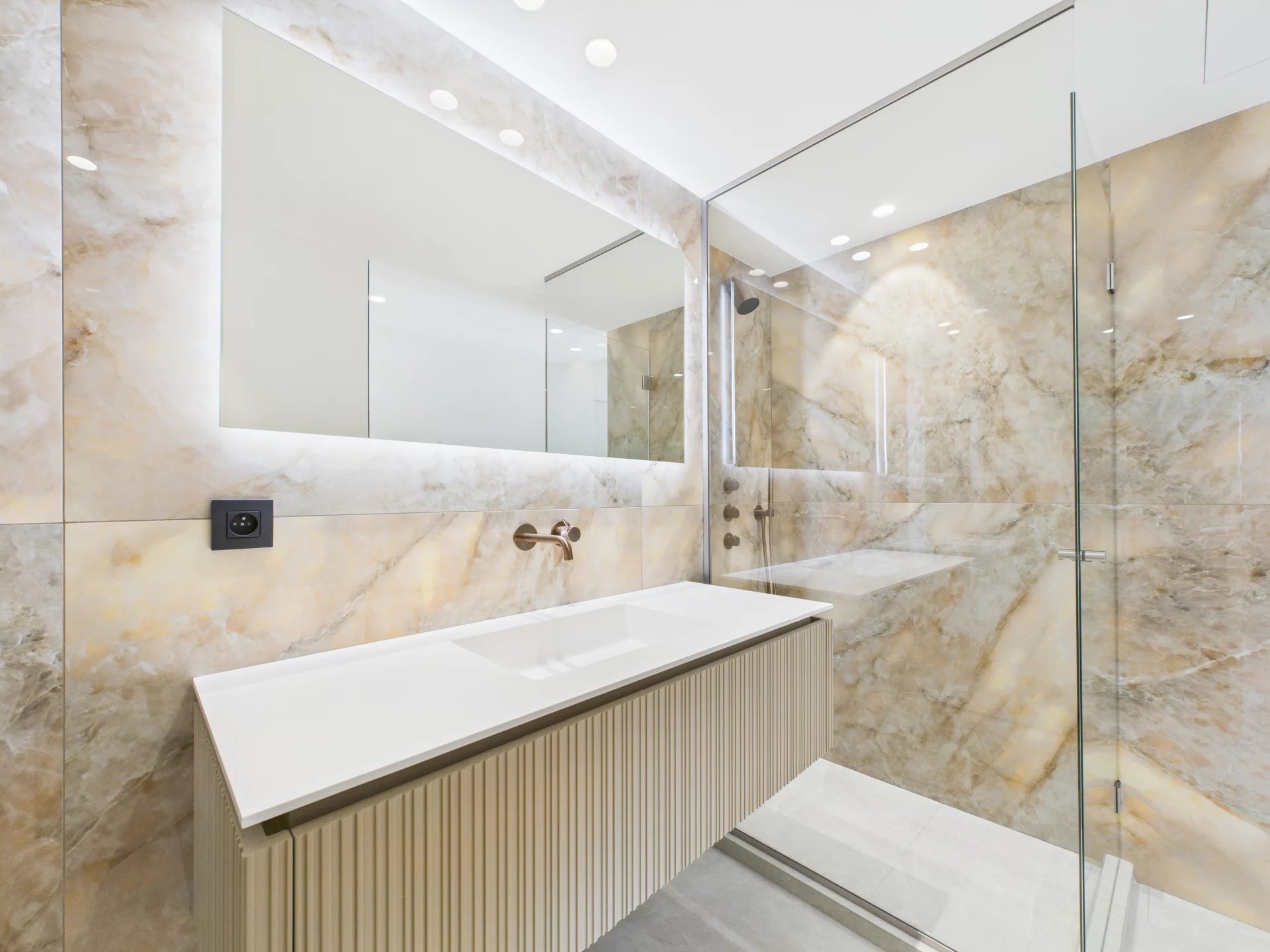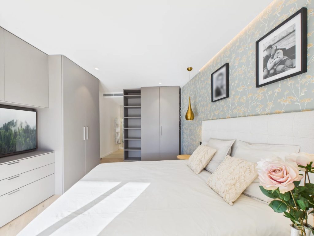 På sovsidan finns en mastersvit med duschrum, toalett och förvaringsutrymmen med direkt tillgång till terrassen med havsutsikt. En andra svit har ett klädkammare samt ett duschrum med toalett.