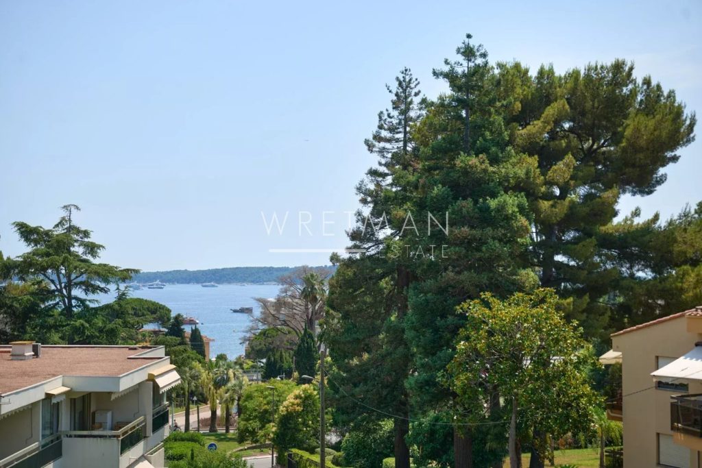 Magnifik lägenhet på 135 m² med fantastisk utsikt över havet och bukten i Cannes, belägen på översta våningen i en lyxig bostadsbyggnad i det eftertraktade området Basse Californie i Cannes.