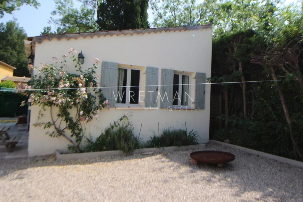 Det separata gästhuset är perfekt för gäster eller som säsongsuthyrning och har ett sovrum. ett badrum och ett kök öppet mot vardagsrummet.